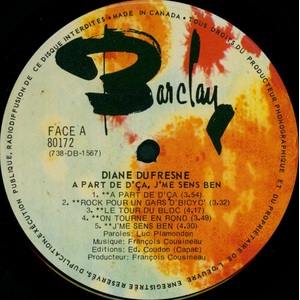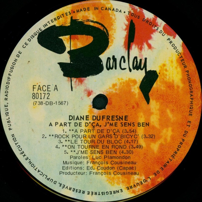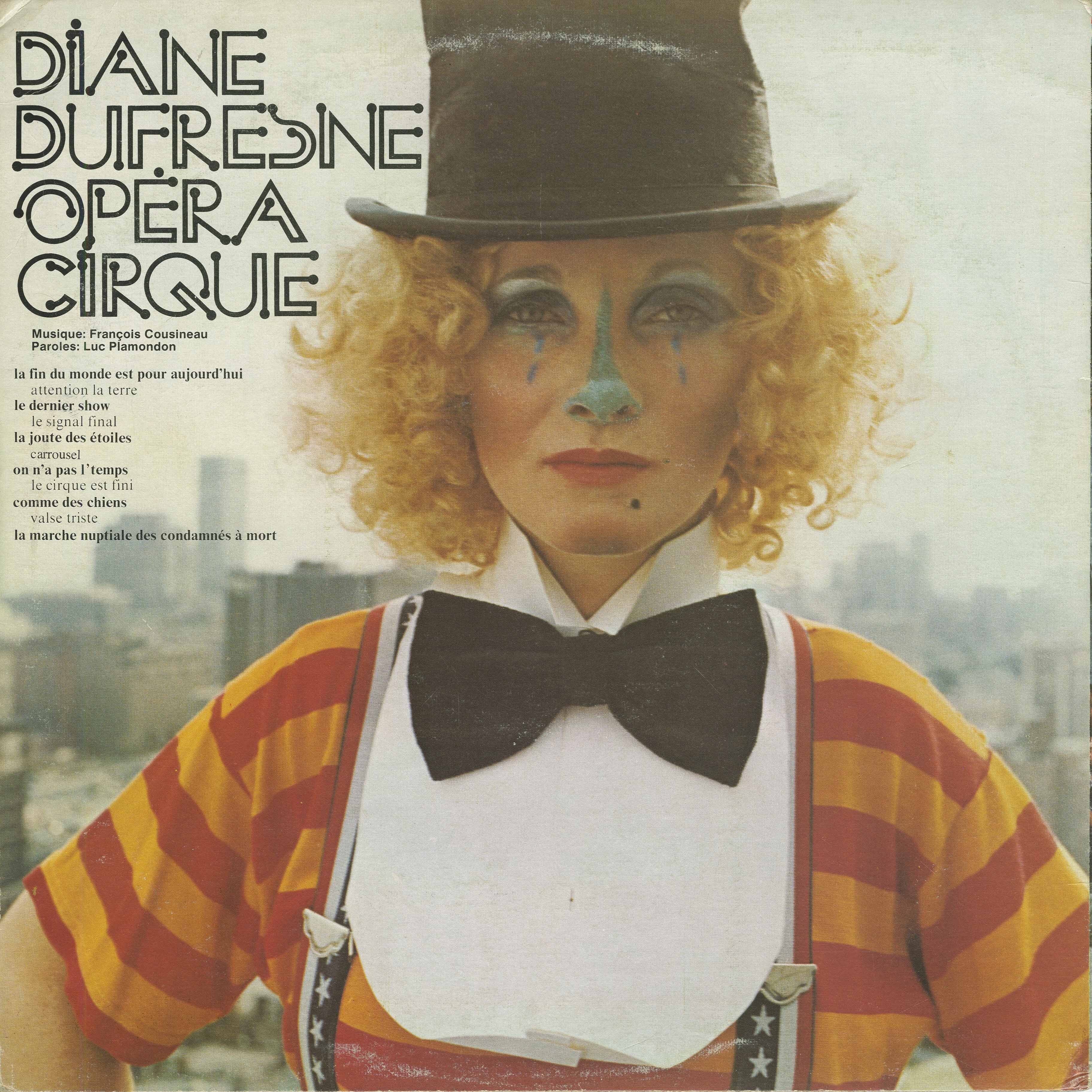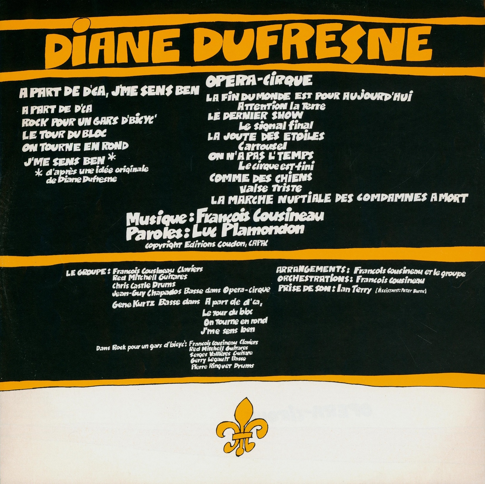 Diane Dufresene's recording career began with an obscure single in 1970, and her first real break came with her recording on the erotic underground soundtrack l'Intiation in 1969......but Quebec's most eclectic Diva was really born in 1972 with her total metamorphosis into a flamboyant and theatrical persona which arrived coincident with the release of her first LP Tiens-Toé Ben J'arrive (her first solo collaboration with Francois Cousineau).