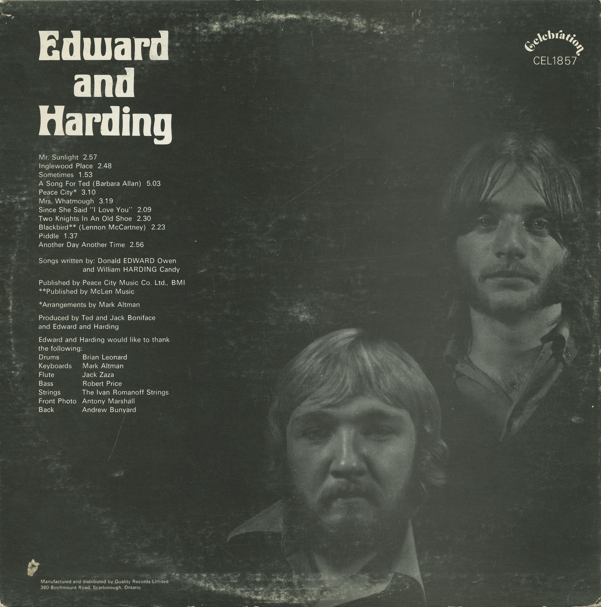 Edward & Harding emerged from the late-1960s music scene at Gordon Graydon High School in Mississauga, where classmates Don Edward Owen and Bill Harding Candy bonded early over guitars, harmonies, and a shared appetite for every style of music they could get their hands on. Before performing as a duo, each had already passed through the local teen-band circuit: Owen had sung with The Fabulous Fables, while Candy was the guitarist in The Soundbenders. When they left their respective groups, they briefly regrouped under the name The Change In Time, playing a sharp mix of Beatles, Who, and Rolling Stones covers that made them staples at school dances and community events around Peel Region.