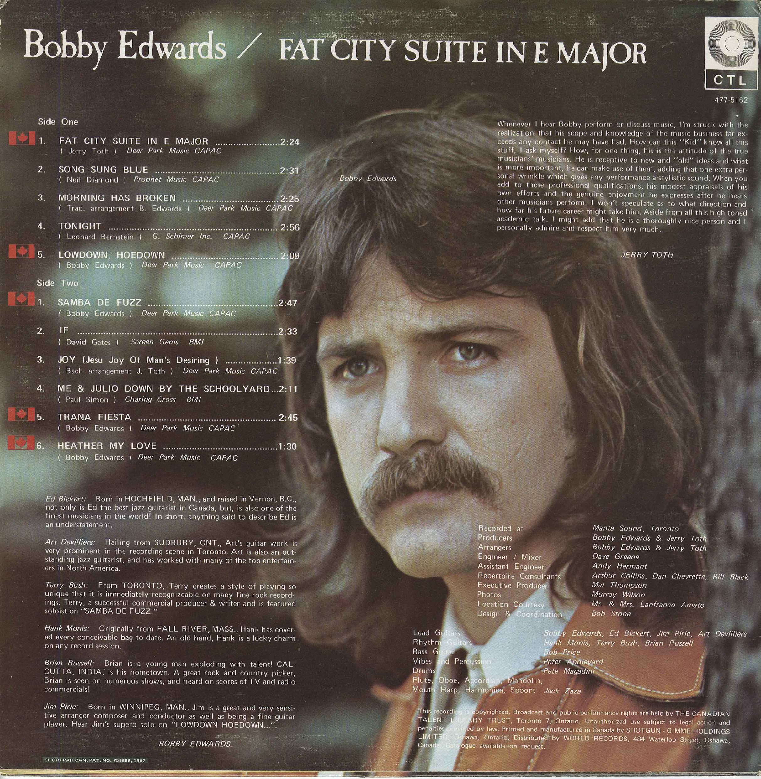 At the same time, Edwards built a parallel career as an arranger, writer, and bandleader, most visibly through his work for the Canadian Talent Library. His 1972 CTL album Fat City Suite in E Major, credited to Bobby Edwards & the Fat City Guitars, introduced an ambitious multi-guitar ensemble supported by reeds, vibes, harmonica, and rhythm section—an atmospheric mix of pop, jazz, and light funk that became one of CTL’s most distinctive releases. Other CTL projects soon followed, including the big-band-with-strings outing Rainbow and the instrumental showcase Guitars, Guitars, later issued by Attic Records. These albums captured the side of Edwards that most casual listeners never heard: a writer with a deep harmonic sense and the ability to shape a large ensemble around the voice of his own guitar.