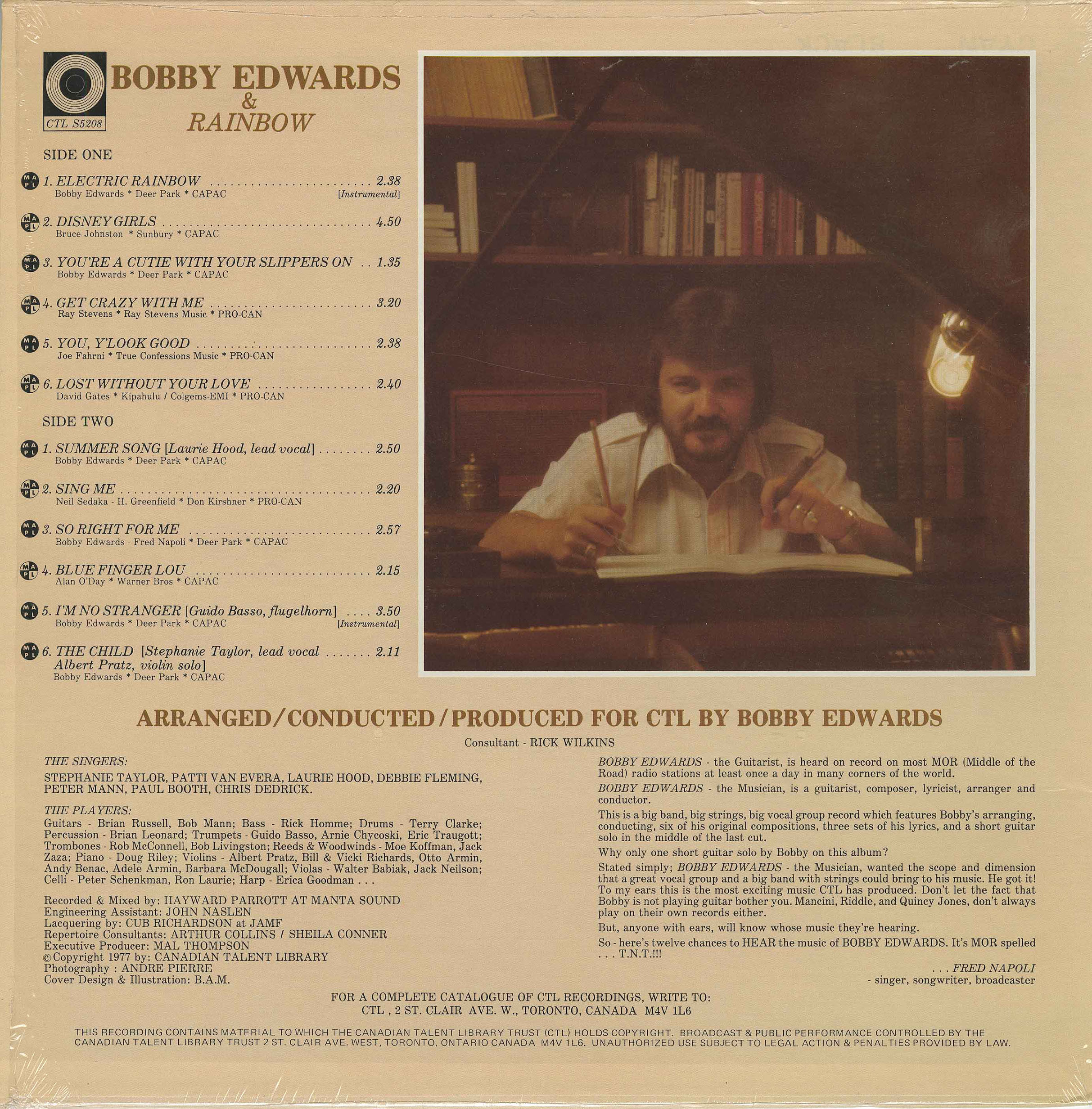 At the same time, Edwards built a parallel career as an arranger, writer, and bandleader, most visibly through his work for the Canadian Talent Library. His 1972 CTL album Fat City Suite in E Major, credited to Bobby Edwards & the Fat City Guitars, introduced an ambitious multi-guitar ensemble supported by reeds, vibes, harmonica, and rhythm section—an atmospheric mix of pop, jazz, and light funk that became one of CTL’s most distinctive releases. Other CTL projects soon followed, including the big-band-with-strings outing Rainbow and the instrumental showcase Guitars, Guitars, later issued by Attic Records. These albums captured the side of Edwards that most casual listeners never heard: a writer with a deep harmonic sense and the ability to shape a large ensemble around the voice of his own guitar.