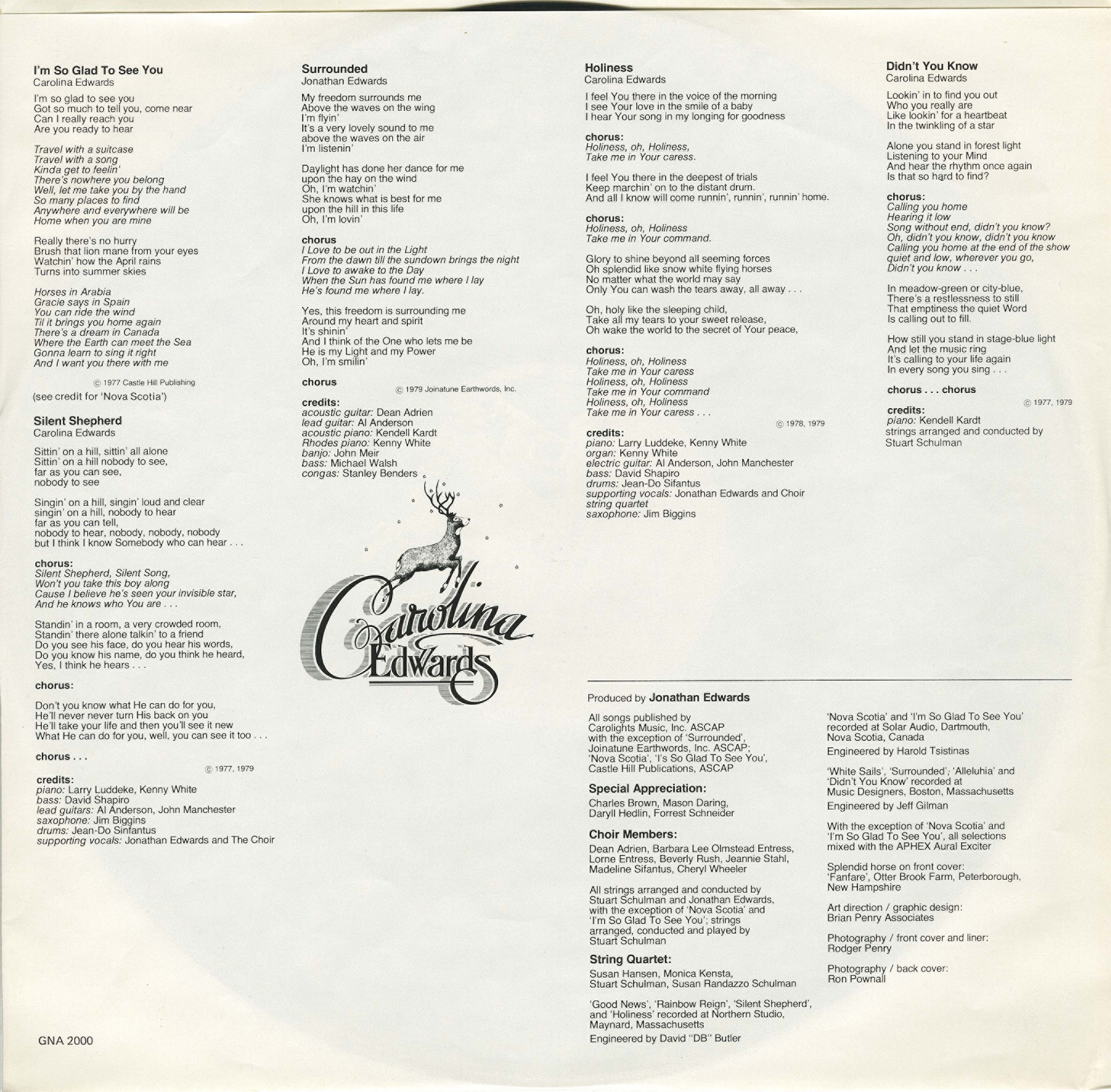 Carolina Edwards was married to Jonathan Edwards, an American draft dodger / singer, best known for the song about his wife entitled "Carolina, Caroline". Carolina and Jonathan spent time in Pictou, Nova Scotia. Besides the popular "Nova Scotia", she also co-wrote the lyrics to Johnny Cash's song "Girl from the Canyon". Rainbow Reign was produced by Jonathan Edwards. Carolina is now known as Serah. Serah donates all proceeds of her music to the WORLD FAMILY FOUNDATION. World Family Foundation is a non-profit charitable foundation that gives to various environmental and humanitarian causes. Music heals!
