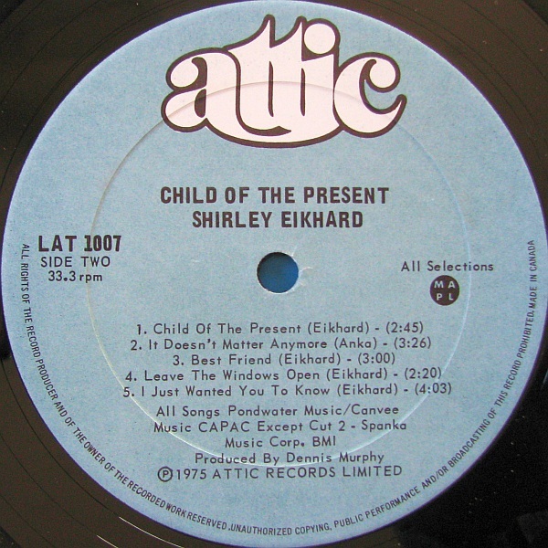 Child of the Present is a studio album by Canadian singer-songwriter Shirley Eikhard, released in 1975. The album produced the singles ‘Play a Little Bit Longer,’ ‘Sure Thing,’ and ‘I Just Wanted You to Know,’ all of which reached the Canadian Top 40. The record documents a transitional period in Eikhard’s career, balancing singer-songwriter intimacy with polished studio arrangements, and contributed to contemporary comparisons with artists such as Carole King and Anne Murray.