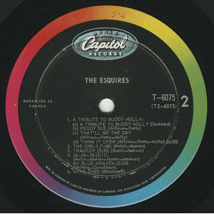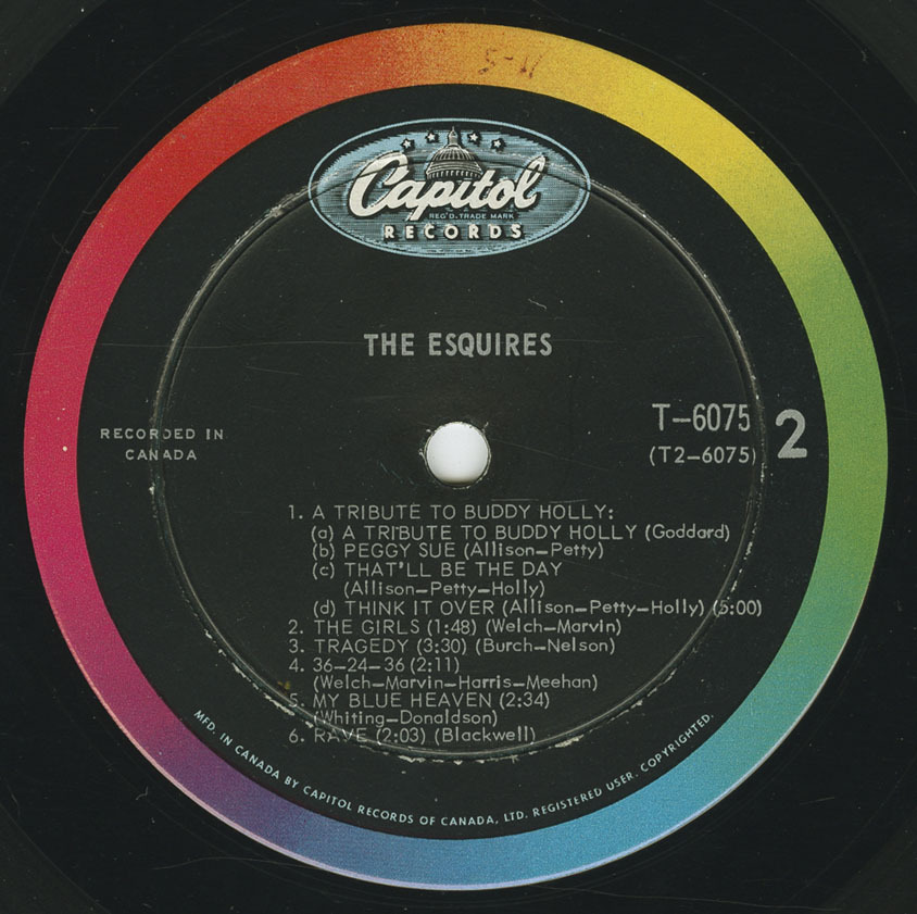 Side two opens with The Esquires’ arrangement of “A Tribute to Buddy Holly” and features Don singing “Peggy Sue”, with vocals on “That’ll Be The Day” and “Think It Over” by Paul and Gary respectively. The boys unanimously agree “The Girls” are one thing they couldn’t get along without. “Tragedy” features Don double-tracking and Paul supply the harmony. “36-24-36” is a spicy number featuring Clint, and measures up very well. Don’s handling of “My Blue Heaven” provides a pleasant relief as The Esquires go cha-cha. Concluding the album is the wild instrumental “Rave”, but I believe there was plenty of raving going on when Gary decided to play lead on a six-string bass and Don decided to play lead guitar.