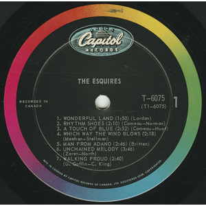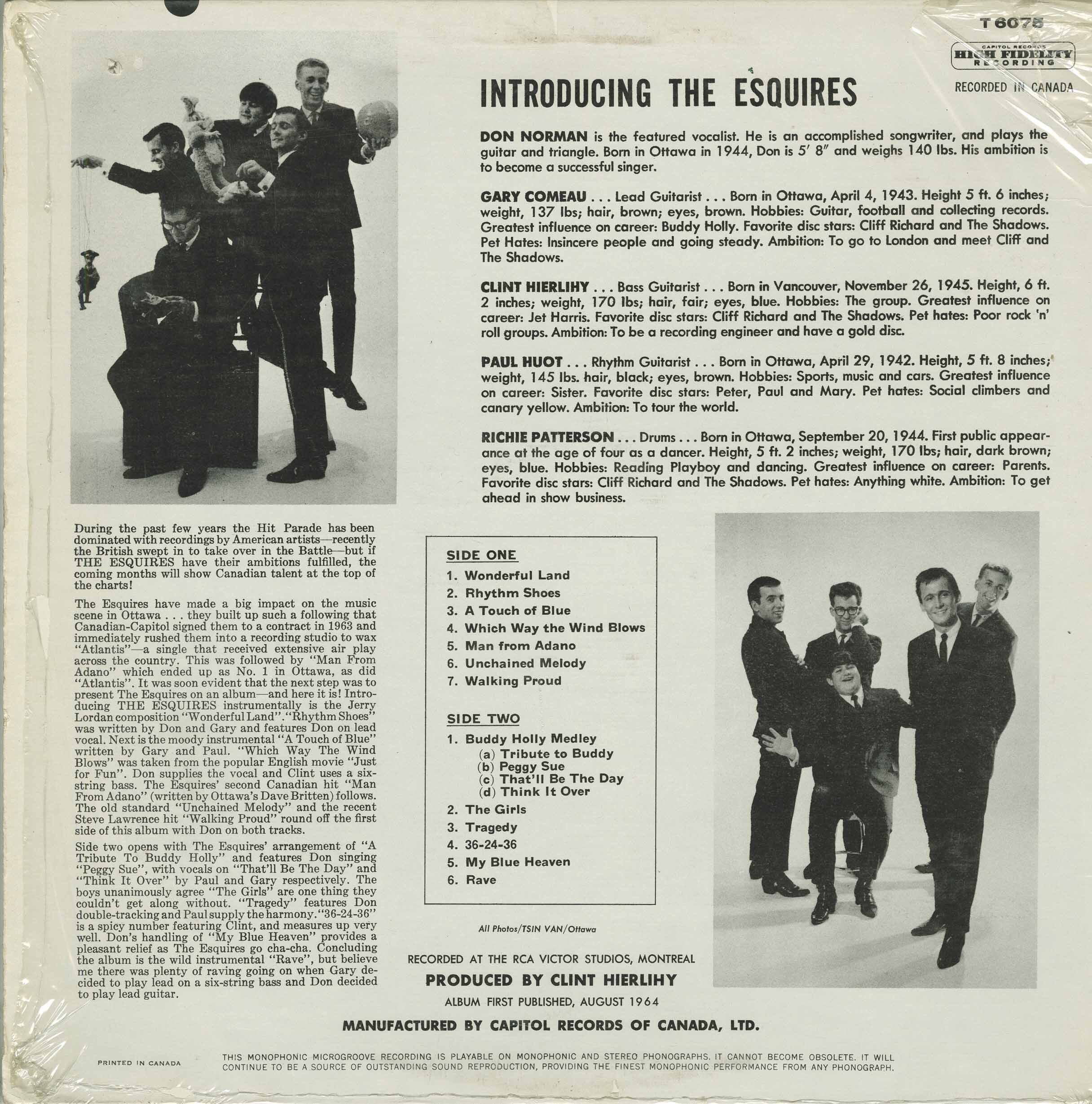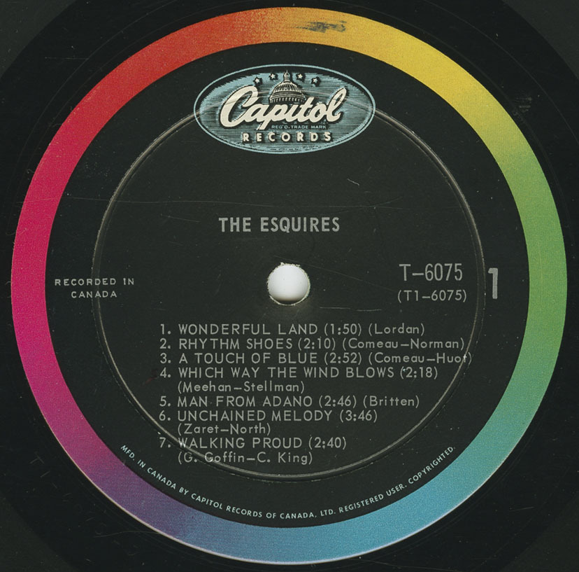 The Esquires have made a big impact on the music scene in Ottawa… they built up such a following that Canadian-Capitol signed them to a contract in 1963 and immediately rushed them into a recording studio to wax “Atlantis”—a single that received extensive air play across the country. This was followed by “Man From Adano” which ended up as No. 1 in Ottawa, as did “Atlantis”. It was soon evident that the next step was to present The Esquires on an album—and here it is! Introducing THE ESQUIRES instrumentally is the Jerry Lordan composition “Wonderful Land”. “Rhythm Shoes” was written by Don and Gary and features Don on lead vocal. Next is the moody instrumental “A Touch of Blue” written by Gary and Paul. “Which Way The Wind Blows” was taken from the popular English movie “Just for Fun”. Don supplies the vocal and Clint uses a six-string bass. The Esquires’ second Canadian hit “Man From Adano” (written by Ottawa’s Dave Britten) follows. The old standard “Unchained Melody” and the recent Steve Lawrence hit “Walking Proud” round off the first side of this album with Don on both tracks.