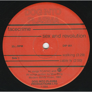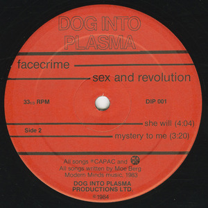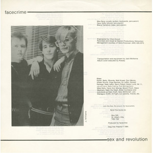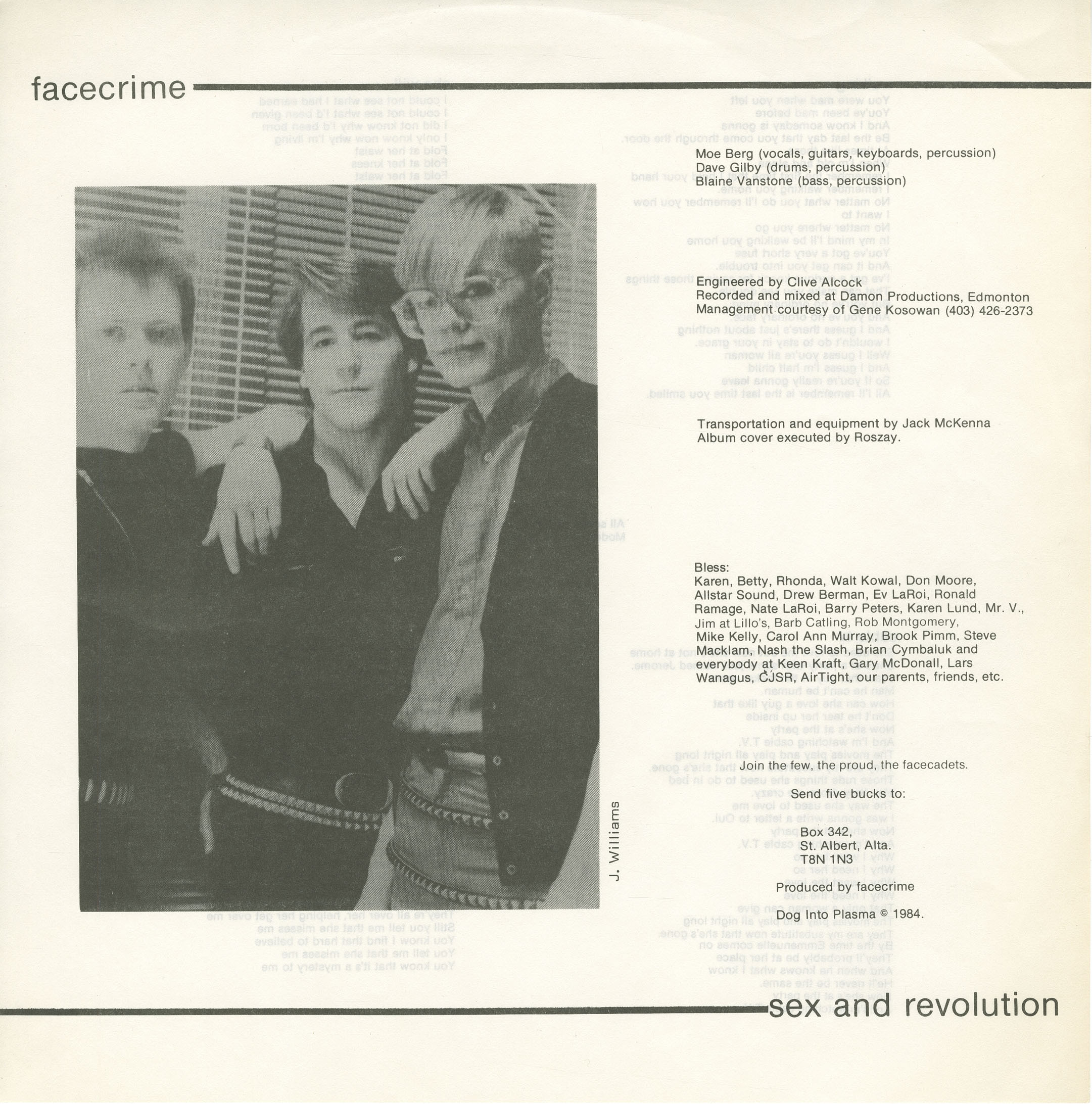 Building on that momentum, Facecrime released one rare but influential EP: Sex and Revolution (Dog Into Plasm, 1984). Recorded at Damon Productions in Edmonton and engineered by Clive Alcock, the record captured Berg’s evolving lyrical depth and musical sophistication. Tracks like “Walking,” “Cable TV,” “She Will,” and “Mystery to Me” explored themes of alienation, suburban discontent, and emotional conflict with sharp arrangements and an underlying pop sensibility.