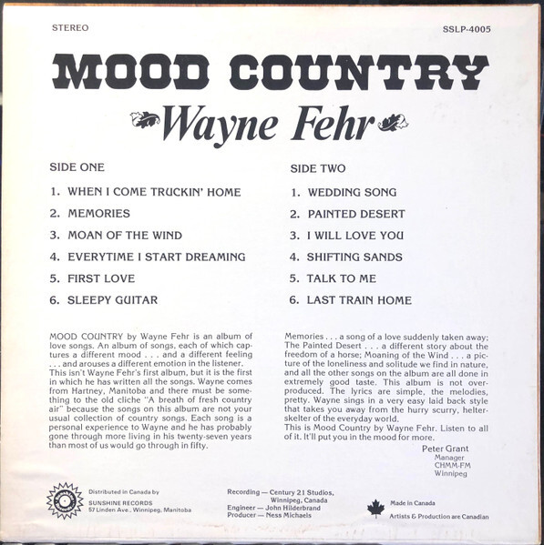 Waye Fehr first performed publicly as a 13 year old winning an amateur talent contest. At age 16 he was touring as part of a travelling band, and in 1969 formed his country group, "Spittin' Image", again touring extensively for the next couple years. In 1973, Wayne Fehr met his wife Rita, who soon joined the Spittin' Image band, and when his uncle showed interest in joining the act, they changed the group's name to "The Country Kinfolk". In 1976, while returning from a show date Wayne and his wife were in an automobile accident which took her life, and left him recuperating from his injuries for more than a year. During his time in a hospital bed, Wayne dedicated himself to his songwriting, and in 1977 he released his first album on the Sunshine Records label, "Mood Country" (SSLP-4005). All eleven songs on the album were original compositions.
