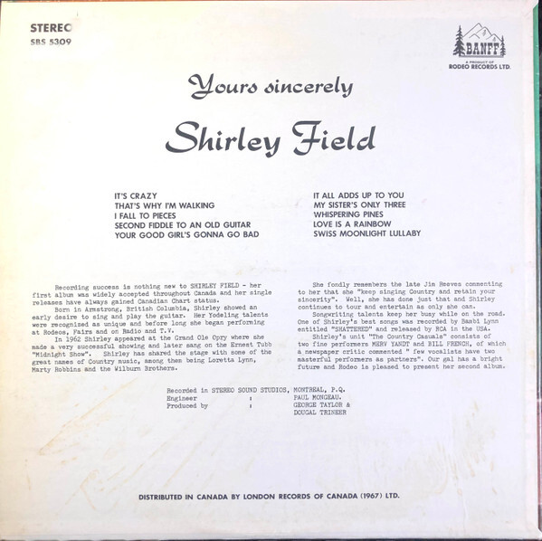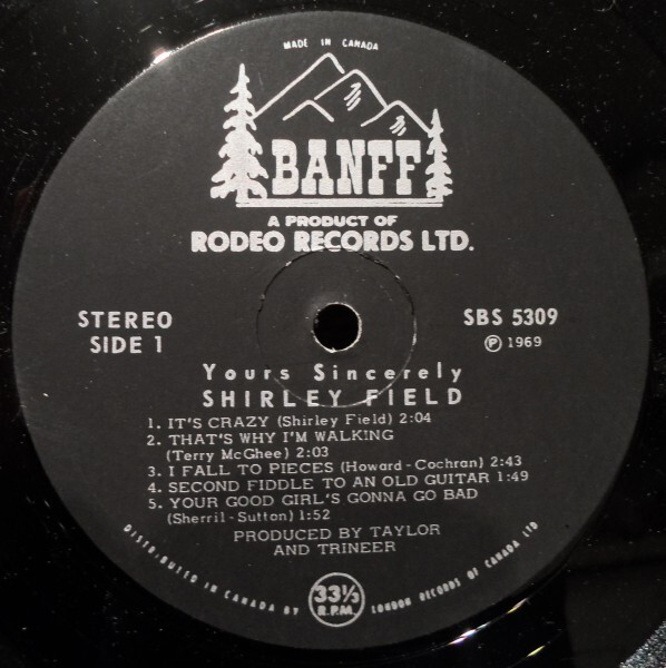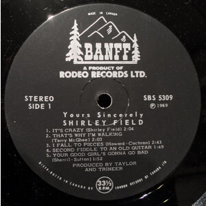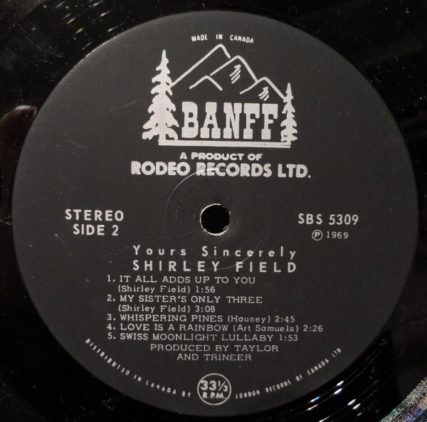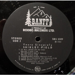 Throughout the 1960s, Shirley recorded a string of releases for the Rodeo/Banff and Melbourne labels — five singles in total between 1963 and 1969, alongside two full-length albums: The Two Sides of Shirley Field (Rodeo RBS-1186, 1963) and Yours Sincerely (Banff RBS-5309, 1969). Among her most collectible records is the 1965 Melbourne single “We’re Going Skiing” b/w “Ski Rock” (WG-3193), a rockabilly-inspired novelty cut that became a ski lodge favourite across Western Canada and remains a sought-after 45 among collectors today.