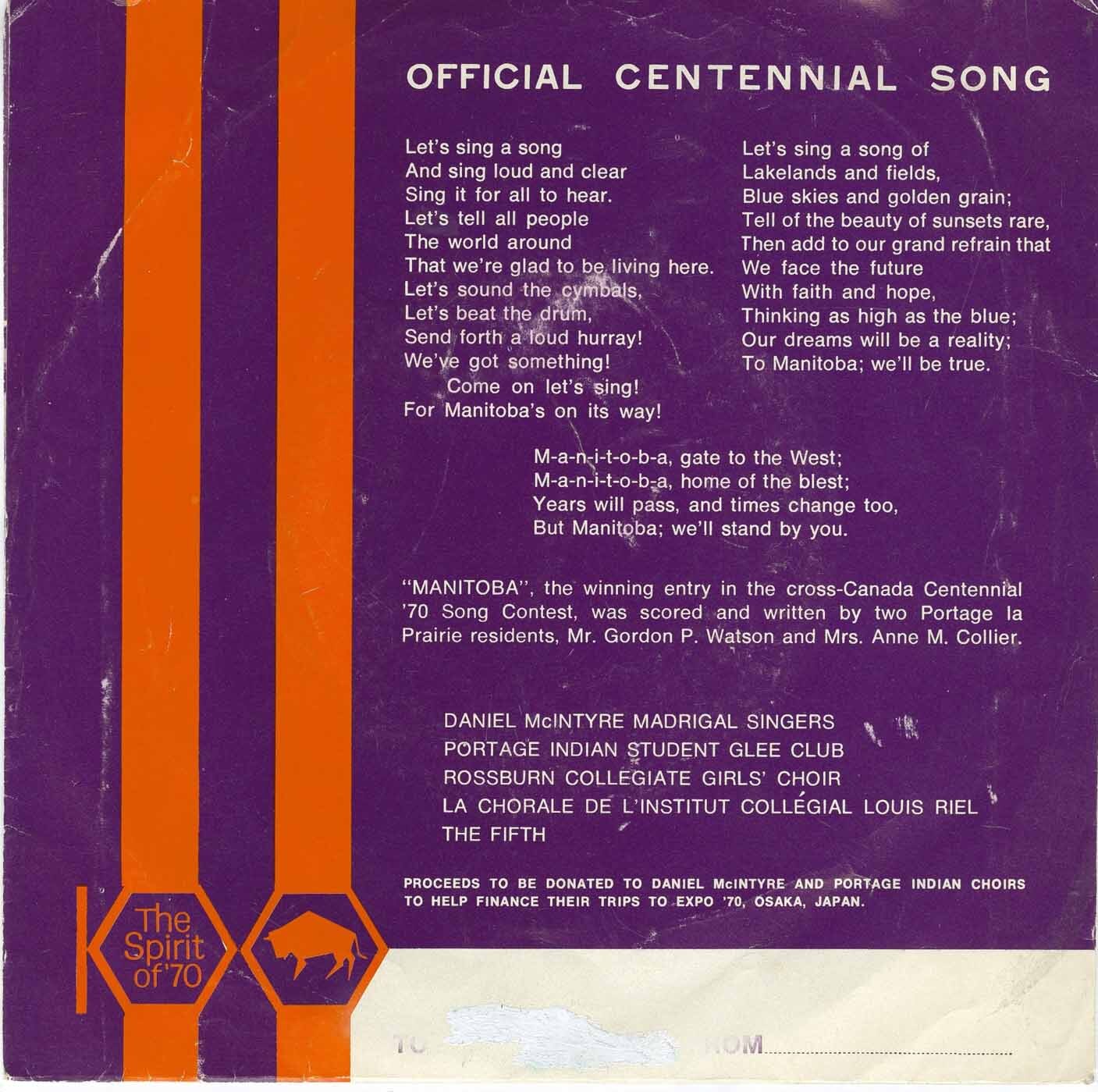 On the "A" side was the English version sung by a 160-child choir composed of the Daniel McIntyre Madrigal Singers, Portage la Prairie Indian Students Glee Club, and the Rossburn Collegiate Girls Choir. It was followed by the French version sung by Daniel McIntyre's Madrigal singers and La Choral de l'Institut Collegial Louis Riel.