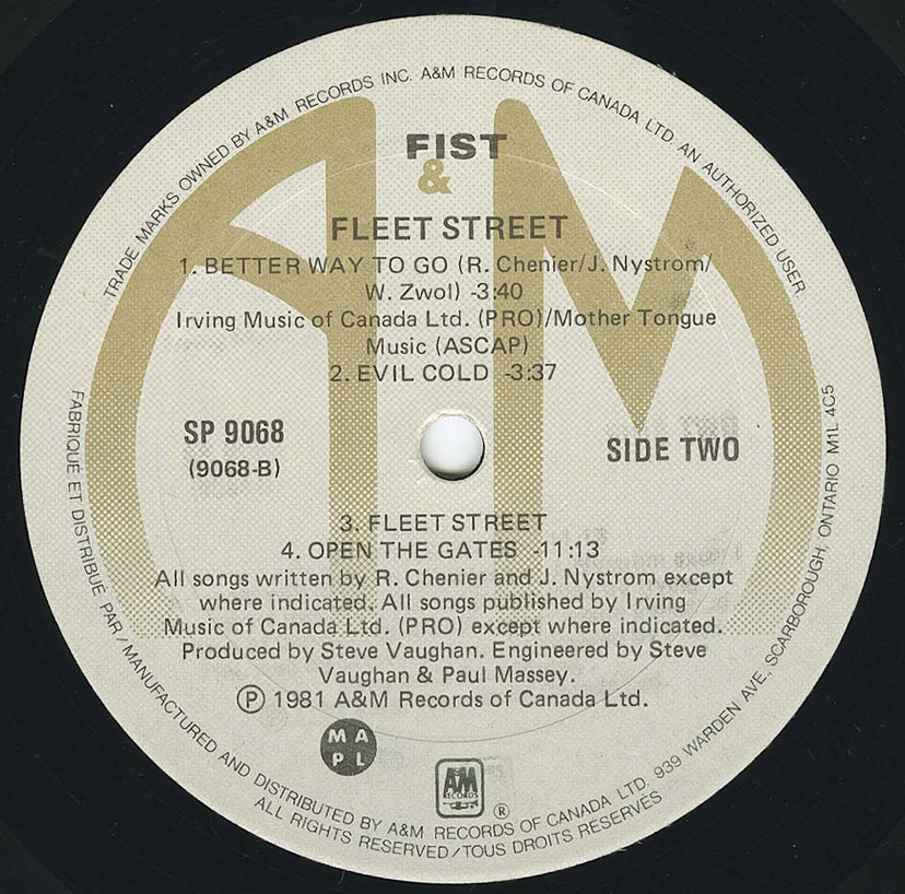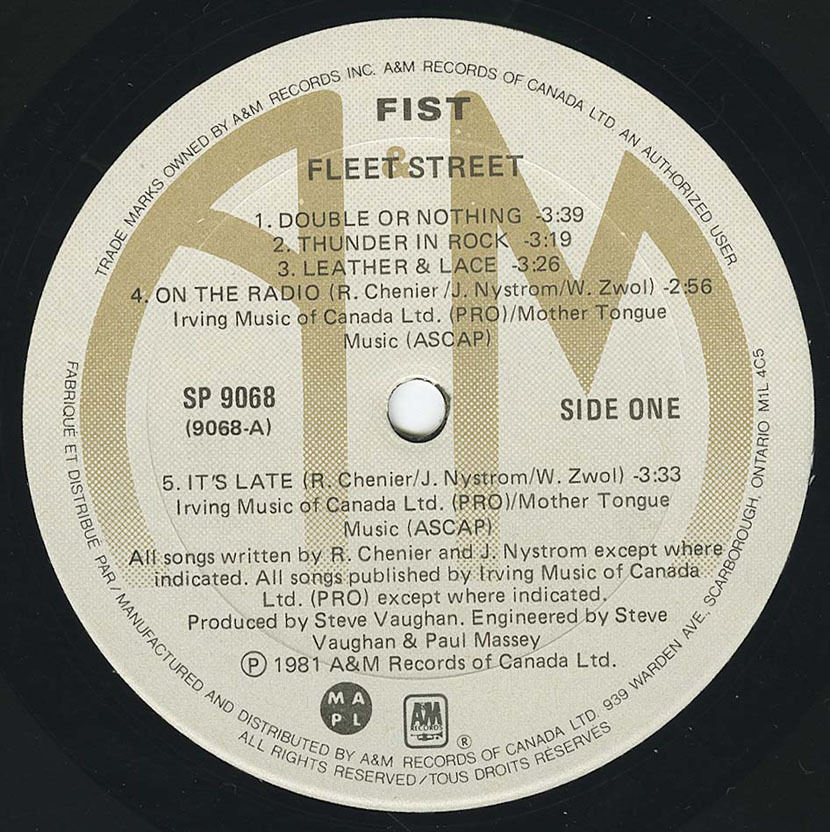 Fleet Street, Canada AKA Thunder In Rock, US/ Europe, are the same album but with different covers for each country. This was Fists third album, produced and engineered by Steve Vaughn.