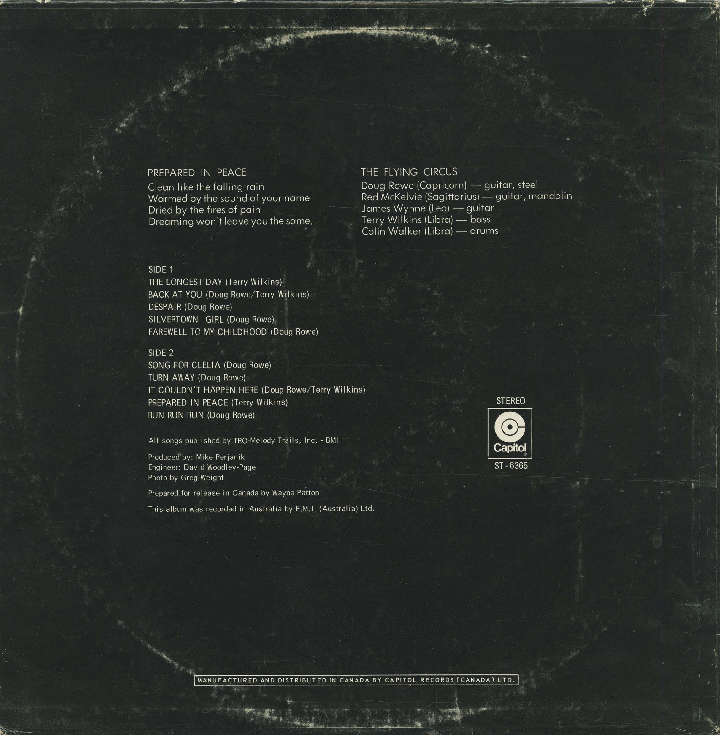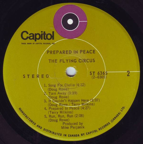 Once in Canada, The Flying Circus found a far more receptive audience. Backed by Capitol Records and Toronto's Music Factory Agency, they embarked on a national tour and began promoting their first Canadian release, Prepared in Peace (1971), issued on Capitol ST-6365. Though recorded earlier in Australia with producer Mike Perjanik and engineered by David Woodley-Page at EMI Studios, the album marked the group’s formal introduction to Canadian audiences. Its all-original material leaned further into folk and country influences, and it was thoughtfully repackaged for the Canadian market by Wayne Patton. While Prepared in Peace was not a Canadian production per se, it served as a transitional record—bridging their pop past with the rootsier direction they would soon fully embrace.