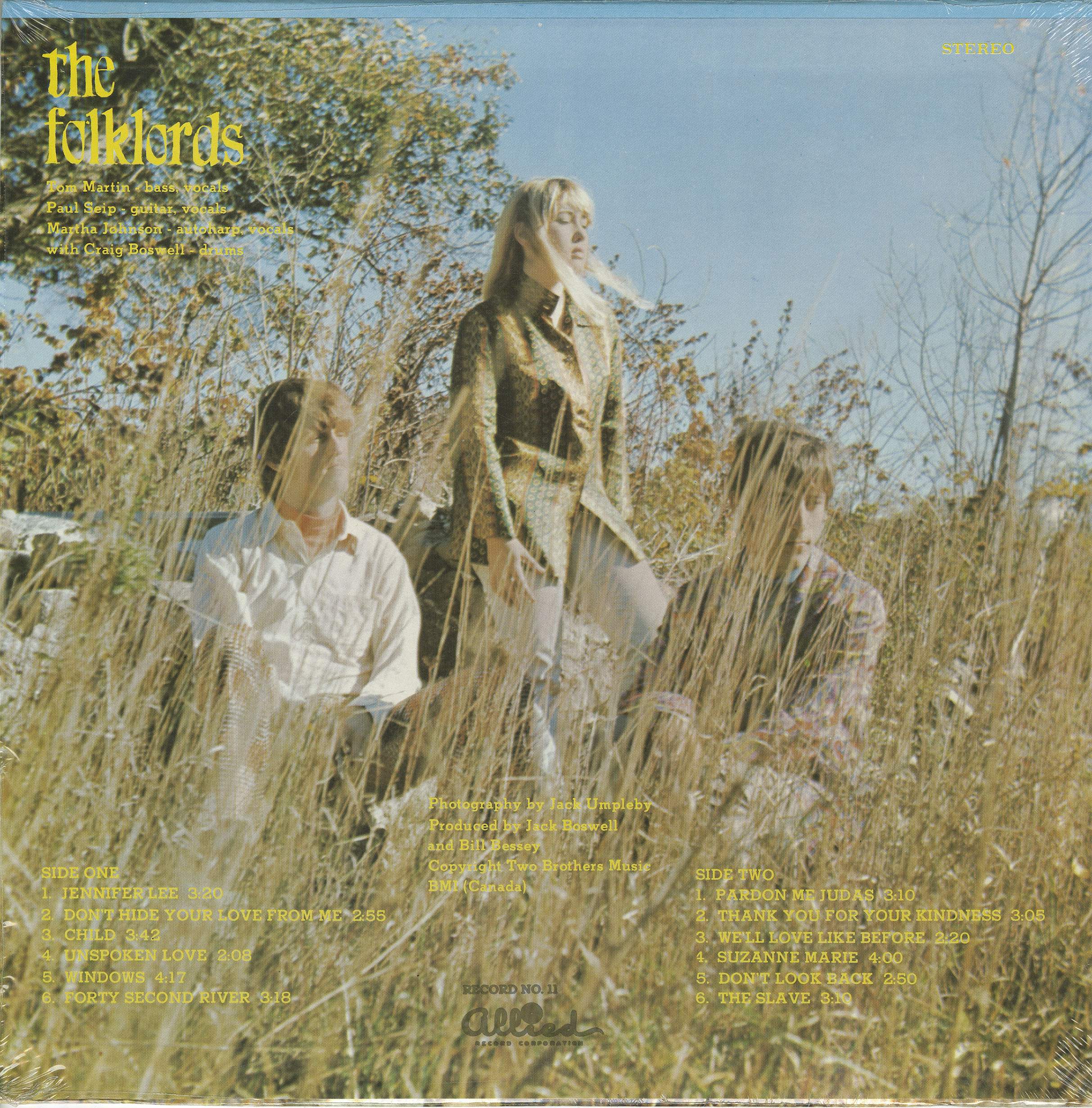 The Folklords were a Toronto, Ontario band who released one of the most sought after folk psych LP's "Release the Sunshine" on Allied Records No. 11 in 1968. The band consisted of Martha Johnson (not the same Martha Johnson of Martha and the Muffins), Tom Martin, and Craig Boswell. In May, 2010, I spoke briefly with Paul Seip and Tom Martin when they first joined citizenfreak.com. They sent a bunch of photos and music.