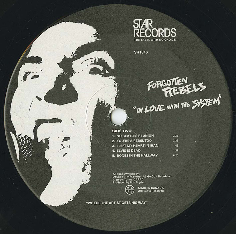 April 7, 1980: 'In Love with the System' LP cover design finished. Concept by myself and Richard Chomko. Tuesday April 29, 1980 - I am informed by Brian Simpkins, manager of Golden Records (record plant) that 3 of Toronto's printing houses will not, I repeat will NOT print The Forgotten Rebels album cover or insert because of profanity. I quote Luis Bunuel to myself: 'In a world as badly made as this one, there is only one road - rebellion.' Despite all of our efforts to convince the printers to do the job - we are 'forced' to black out the title of one of the songs on the back cover if we want the album out on time. We are working on getting a Ramones show for the area and having the Rebels open up. Wednesday, May 14, 1980 - The Forgotten Rebel 'In Love with the System' LP is released on Star Records - The Label with No Choice. Wednesday, May 21, 1980 - The Ramones come to Star Records, Hamilton for an autograph session. That night The Forgotten Rebels open up for them in Burlington. The agreement was The Rebels could open for the Ramones if they did NOT play 'I Wanna be a Nazi'. Of course, they did. Still in search of the perfect haircut. June, 1980 - I spend assuring the entire civilized world that The Forgotten Rebels are not, I repeat NOT a neo-nazi organization bent on world conquest. It starts with a gentleman who attends the Ramones/Rebels show who happens to have lost his whole family in the holocaust. He is so outrages by 'Nazis' that he call the office of the Attorney-General who proceeds to call the Burlington Police. On Wednesday June 18, I meet with Sgt Sullivan and detectives in Burlington who have an actual copy of 'In Love with the System' with insert. I assure them that these 'kids' are 'harmless' (are they really?) And that they are simply total knee-jerk reactionaries who will do anything to shock you - bur there's nothing much behind it. This seems to satisfy the police and the Attorney General BUT NOT, I REPEAT NOT CFNY. (Believe it or not - that bastion of 'alternative' music was the most offended party. Mainly because of 'Third Homosexual Murder' on the EP.) Backtracking a little - on June 10, 1980 - I had to meet with David Marsden and other staff of CFNY to assure them that The Forgotten Rebels will really not shoot you if you're gay - but that song was merely their way of 'reporting'. I still doubted we were going to get any airplay - and we didn't. It seems everybody misses that strategic verse in Mickey's song 'Nazis' where he says: 'You'd have to be quite an idiot...to believe in this mess.' (Source: Bob Bryden's website)