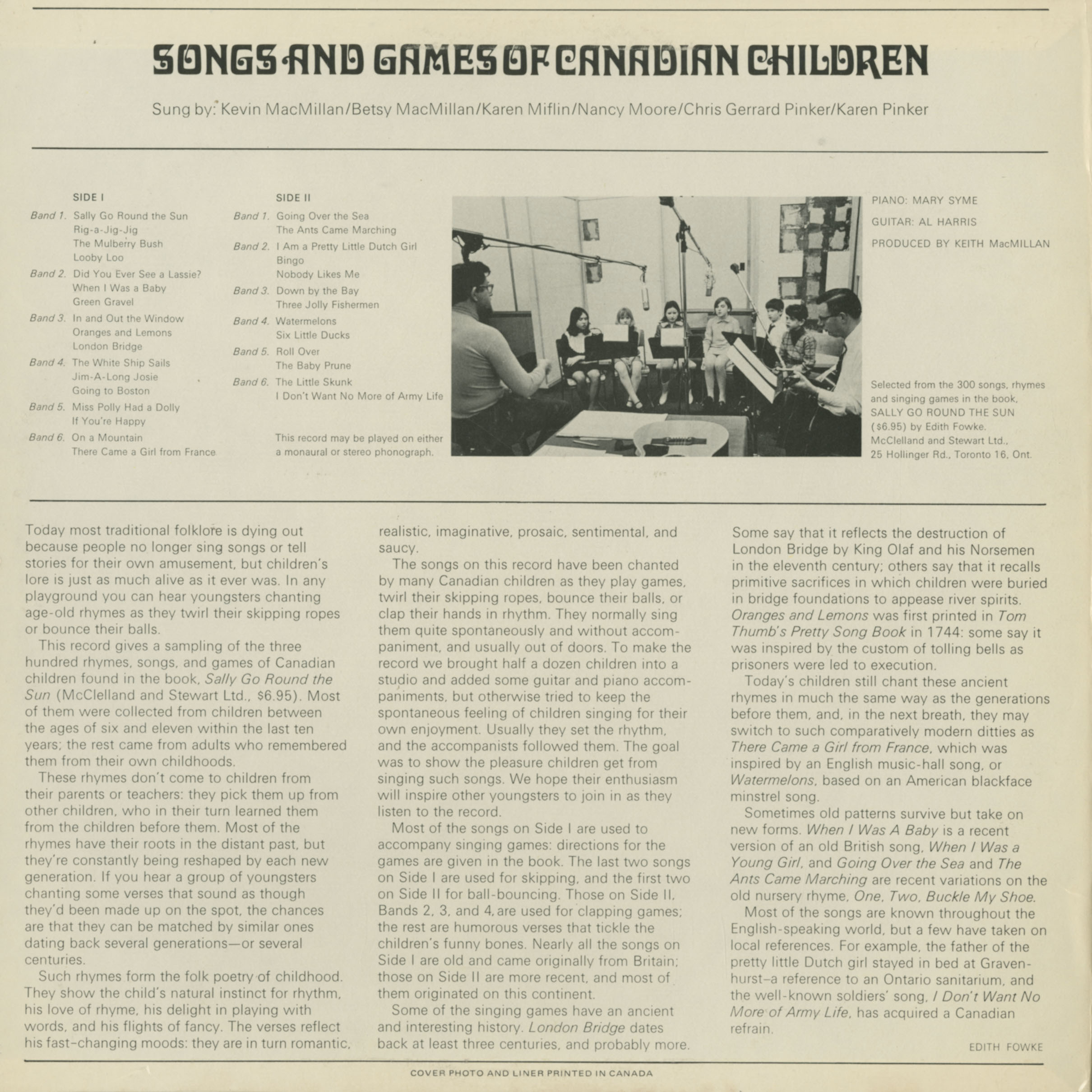 This record gives a sampling of the three hundred rhymes, songs, and games of Canadian children found in the book Sally Go Round the Sun (McClelland and Stewart Ltd., $6.95). Most of them were collected from children between the ages of six and eleven within the last ten years; the rest came from adults who remembered them from their own childhoods.