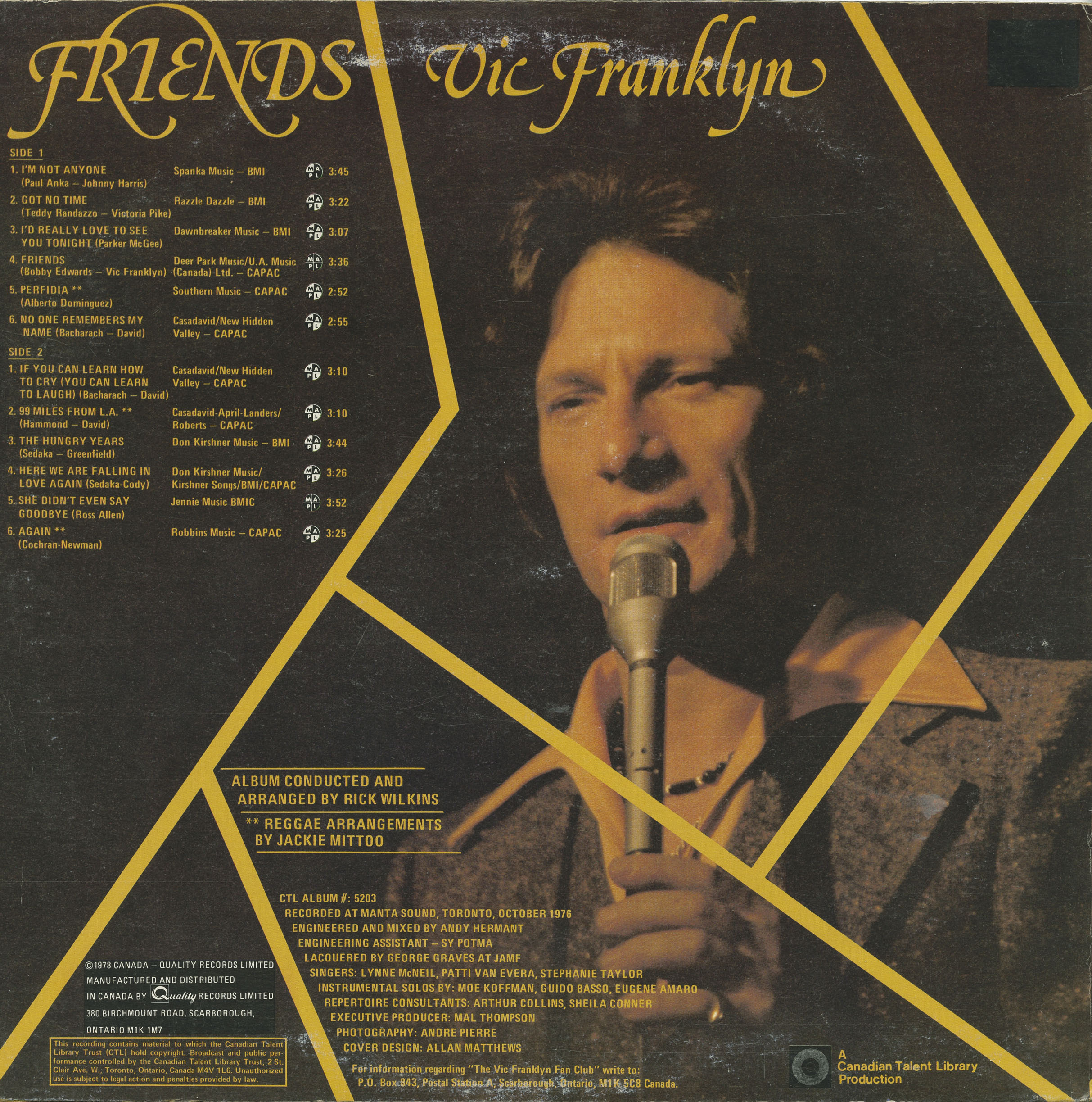 What survives is a compact but distinctive body of work that captures a particular moment in Canadian studio culture. A Welsh-born vocalist in a Toronto room, backed by Rick Wilkins’s charts, Jackie Mittoo’s rhythmic sensibility, and the city’s finest session players, recording albums intended for broadcasters yet built with far more care than their modest budgets would suggest. For those who still search out the original CTL and Birchmount pressings, Vic Franklyn remains less a forgotten lounge singer than a reminder of an era when Canadian music could still embrace late-night elegance, soft rhythm, and a singer who understood the value of understatement.