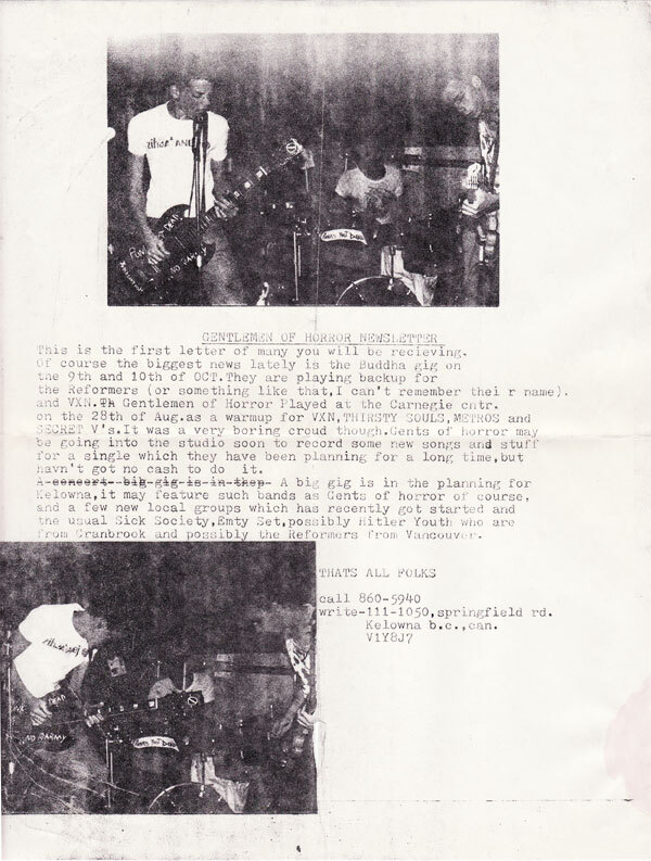 This was the only release by GOH. It was recorded in November of 1980 in Donny Walchuk's basement and released in January 1981. It was recorded for $60 in one evening, live to a reel to reel 4-track, with the vocals overdubbed. We pressed 200 copies (at Praise Records in Vancouver-a Christian pressing company!) with blank, white labels and hand drew on them with coloured felt markers, saving a $50 printing charge. Every label was unique; some had the songs titles, some had things like "Virgin Records" and anarchy symbols on them, one even had a very good likeness of Barney Rubble drawn by Tom.