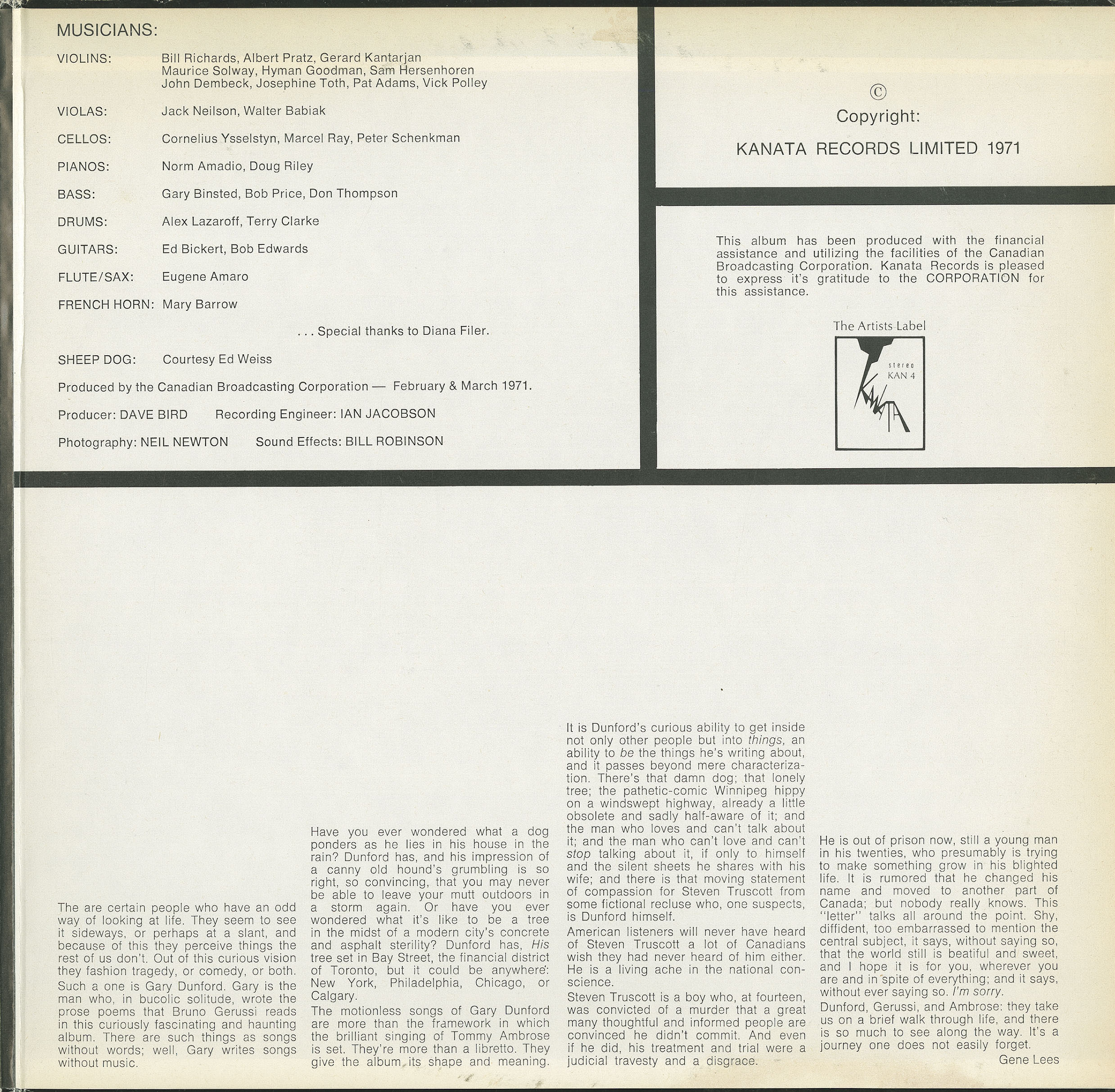 This offbeat collaboration by two Canadian entertainers and a reclusive poet was borne out of the CBC radio show Words And Music hosted by actor Bruno Gerussi in the early 1970's. The weekly show featured interviews, music and monologues done before a live audience in a small theater. Tommy Ambrose was a regular singing guest. "We had an instinct for each other's work" Gerussi said. "I would read a monologue and Tommy would come up with a song to follow it that fit perfectly into the mood we established." The monologues were written by Gary Dunford, a former Toronto newspaperman who became a recluse by choice in the Toronto wilderness. His pieces covered a wide range of emotions but all of them offered wit, immediacy, and a sense of slightly crazy, slightly surreal truth.
