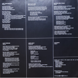 We rehearsed the crap out of these songs before going in to studio, because studio and 2” tape cost so frickin’ much and we were paying for all the recording costs while Zulu was paying for pressing and production. We did 8 track demos at ICA studios with Jeff Goodrich, about 11 songs and we narrowed it down to the 6 on the EP. Ironically the most successful song, Just Another Day, was our 7th pick and wasn’t going to go on the EP, but Grant McDonagh of Zulu records convinced us to record it instead of 7th Victim, which appeared on the Six Friends album. Our original drummer quit before we went in to studio due to artistic differences. We rehearsed with Matt Johnson of French Letters at the time (and later 54-40) but ended up using Ian Noble from The Modernettes in studio. Ian was about to head to Percussion Institute of Technology (MIT but for people who hit things with sticks), but offered to drum on the EP for us. Ironically Ian would return to Vancouver and join us after Six Friends was released, but he didn’t drum on Six Friends, that was Culture Shock (my second band) drummer Rob Tomkow... it’s kind of complicated.