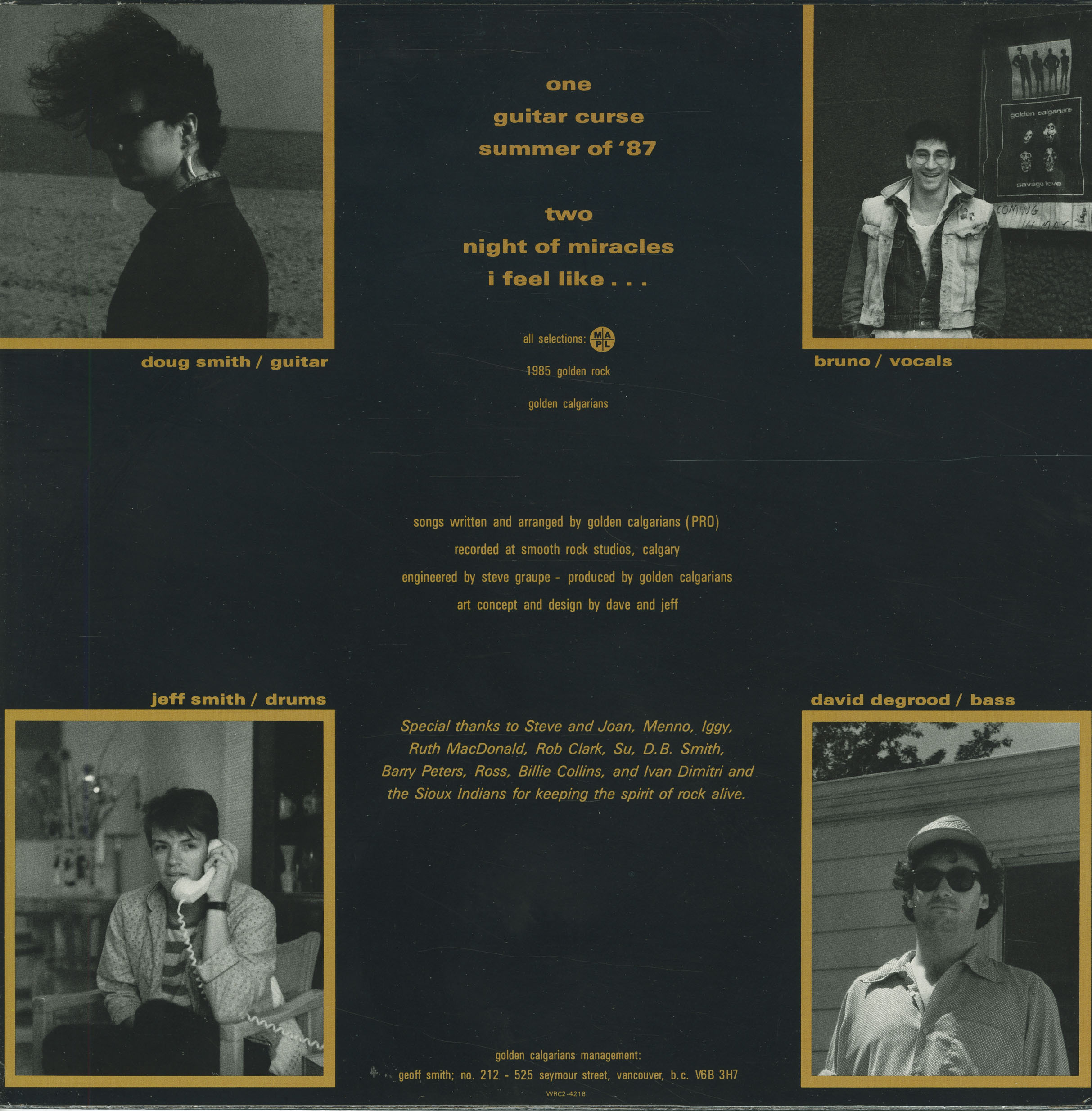 The Golden Calgarians began taking shape in northwest Calgary in the late 1970s, when Queen Elizabeth High School classmates Geoff “Jeff” Smith and a charismatic, sharp-tongued singer known simply as Bruno formed a band called The Remains. The name was a teenage nod to the Ramones, their earliest heroes, but the group quickly grew beyond punk imitation. By 1980 they had abandoned their morbid moniker, adopted the name The Golden Calgarians, and settled into the combination of humour, fuzz-blasted guitar, and prairie suburban absurdism that defined them for the next half-decade.