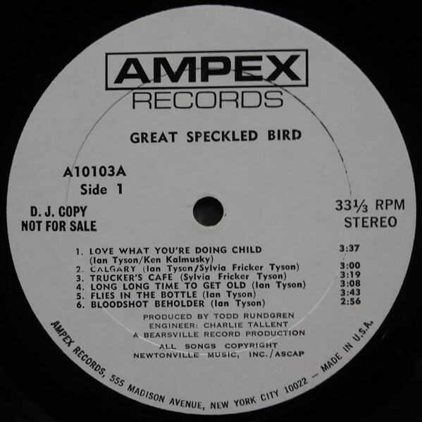 The material on Great Speckled Bird was about evenly divided between songs written either by Ian Tyson or Sylvia Tyson, though the pair collaborated on "Calgary," and Garrett got a co-credit with Ian for "Rio Grande." The sole cover to find its way onto the LP was "Crazy Arms," a huge country hit for Ray Price in the mid-1950s, and subsequently covered by everyone from Jerry Lee Lewis, Willie Nelson, and Chuck Berry to Linda Ronstadt, Patsy Cline, and Waylon Jennings. "Ian and Sylvia's album was the first record of its kind cut in Nashville," N.D. Smart observed in John Einarson's Desperados: The Roots of Country Rock. "They couldn't get used to the longhairs. They all figured that you had to have the hit done before lunch or there was something wrong with you. But we weren't in there for two or three hours watching the clock. We were in the studio for eighteen hours at a stretch. And [Nashville session men] David Briggs [on piano] and Norbert Putnam [on bass] were loving this, because they were getting triple scale."