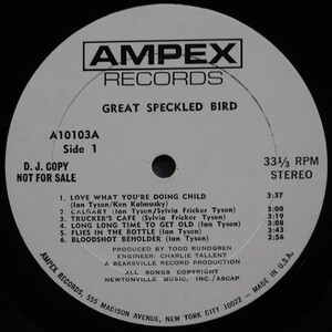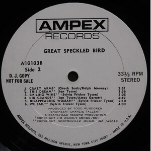 Also in the lineup that recorded Great Speckled Bird was steel guitarist Buddy Cage, later to join the New Riders of the Purple Sage; lead guitarist Amos Garrett, who developed a distinctive technique of bending two and three strings, in part from working in tandem with a steel player (and would later work with Maria Muldaur, playing the solo on her hit "Midnight at the Oasis"); and drummer N.D. Smart II, who'd played with the Remains and Mountain (and would later play alongside Emmylou Harris and Gram Parsons in the Fallen Angels). When they recorded the album in Nashville in late 1969, the producer was a young Todd Rundgren, then just starting his simultaneous careers as a producer and solo recording artist.