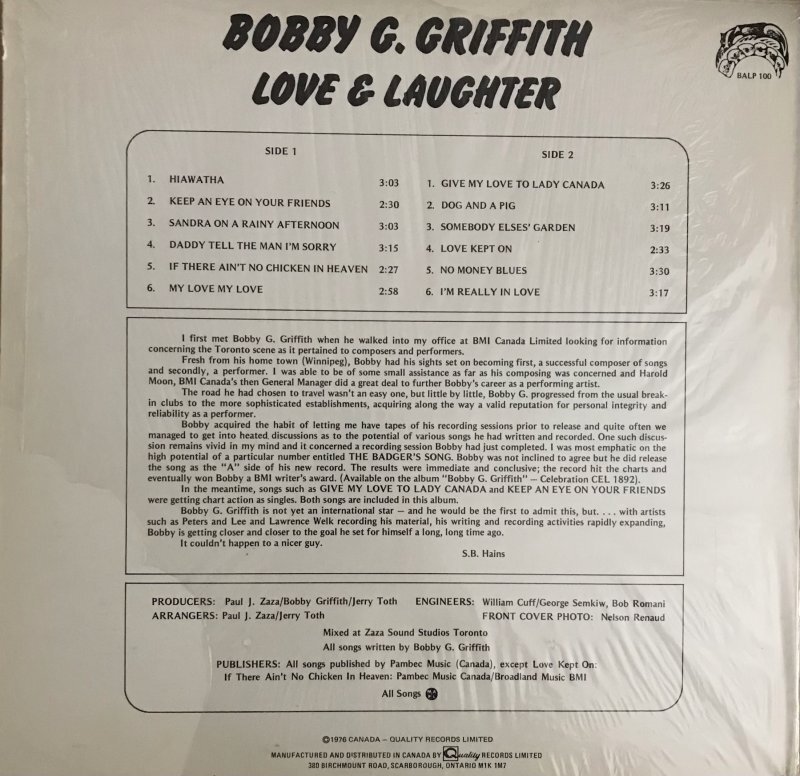Determined to gain greater control over his recordings and career, Griffith established his own label, Badger Records, in the mid-1970s. The label was named after “The Badger’s Song,” his first significant international success. Gerry Beadle, who had written the liner notes for Griffith’s CTL album, initially served as National Promotion Director and later became president of the label, giving Badger an unusually professional structure for a small, artist-run Canadian imprint. In July 1975, Badger Records secured a Canadian distribution deal with Quality Records Limited, followed by a United Kingdom distribution agreement with Music World Scotland in November 1976.