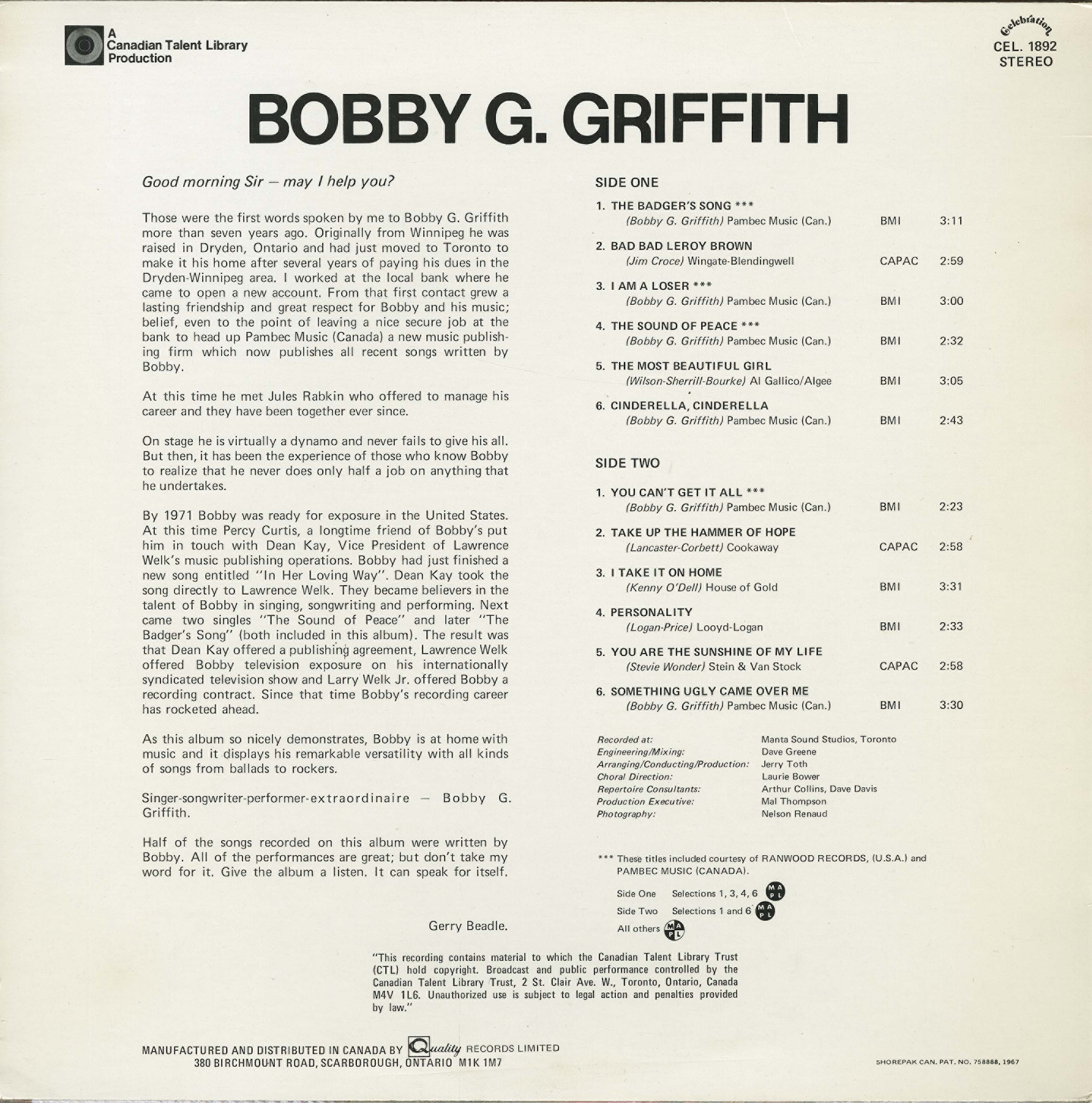 Those were the first words spoken by me to Bobby G. Griffith more than seven years ago. Originally from Winnipeg he was raised in Dryden, Ontario and had just moved to Toronto to make it his home after several years of paying his dues in the Dryden-Winnipeg area. I worked at the local bank where he came to open a new account. From that first contact grew a lasting friendship and great respect for Bobby and his music; belief, even to the point of leaving a nice secure job at the bank to head up Pambec Music (Canada) a new music publishing firm which now publishes all recent songs written by Bobby.