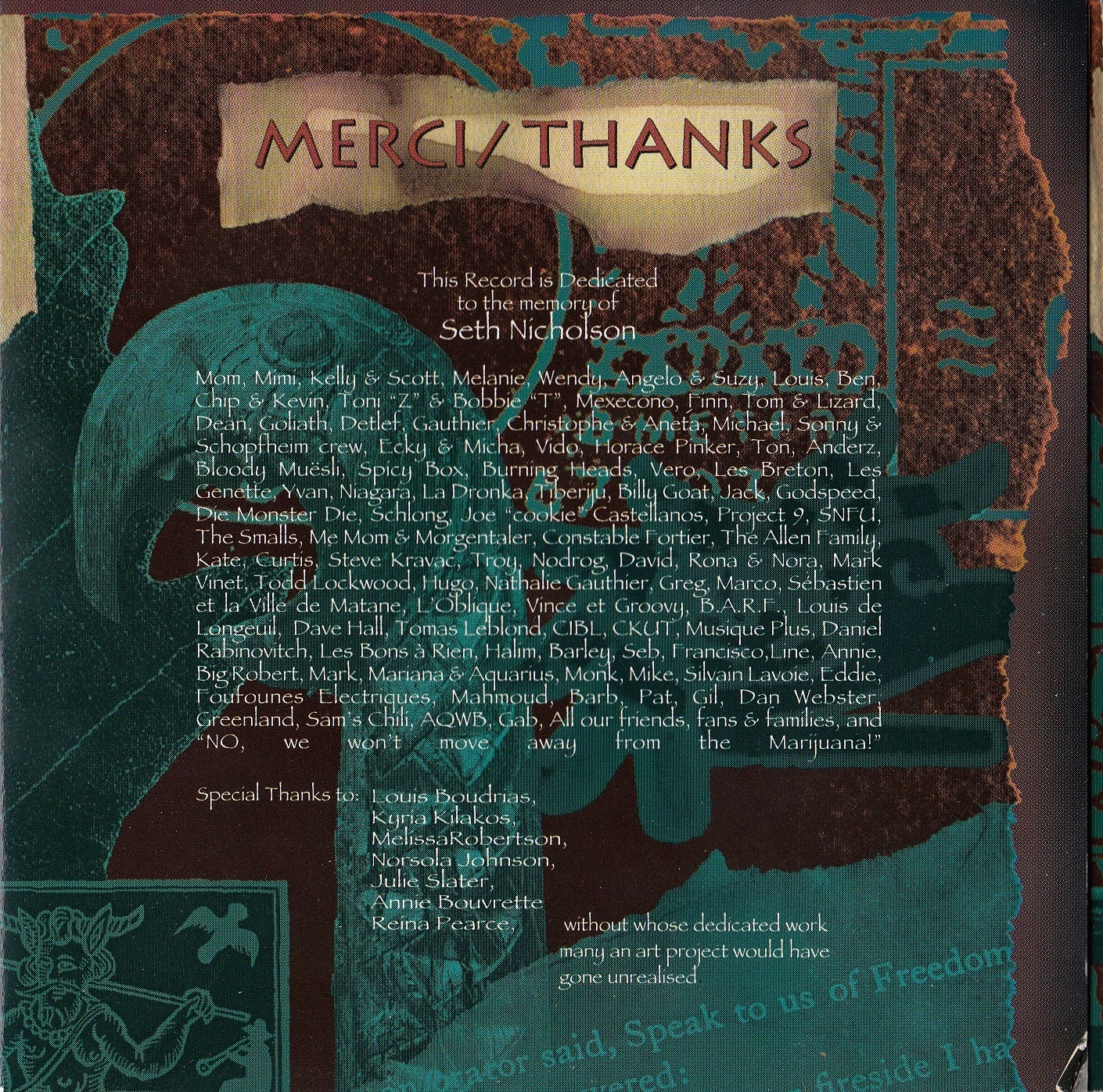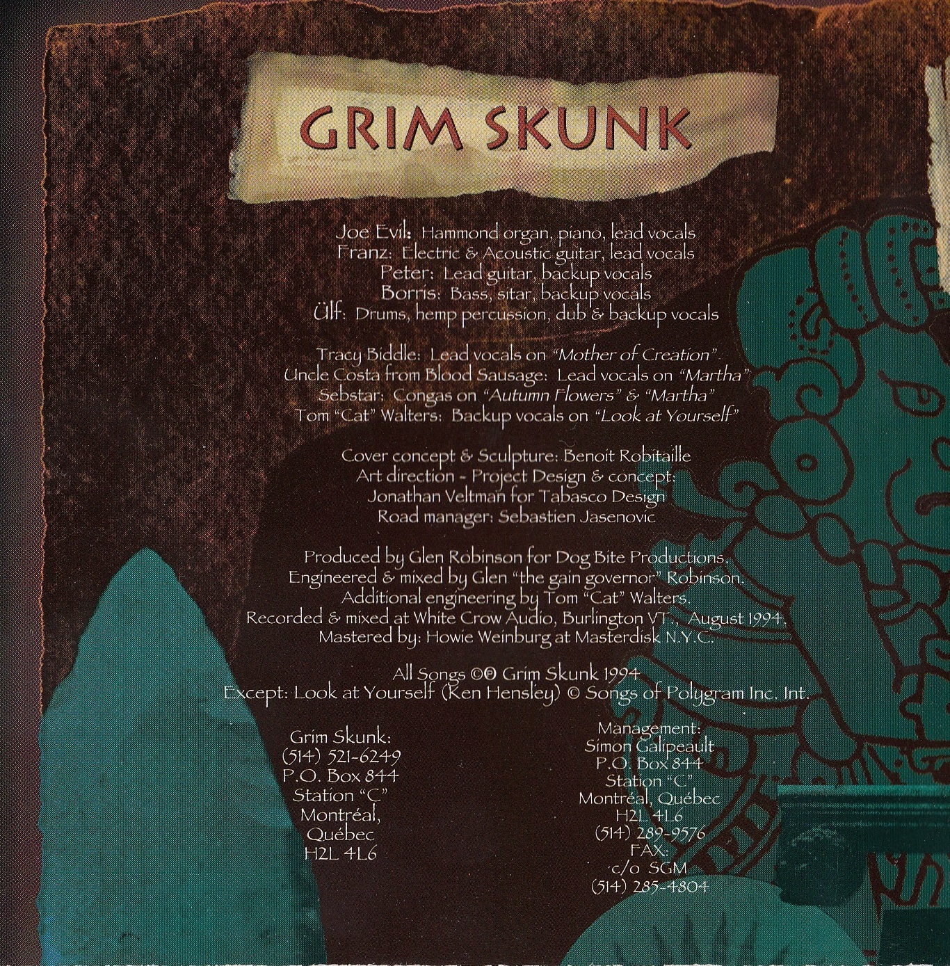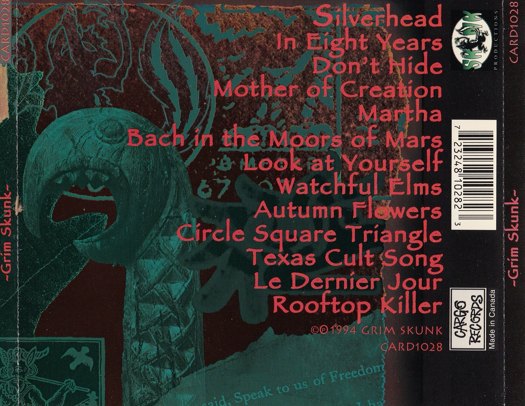 The original lineup featured Franz Schuller (guitar, vocals), Joe Evil (vocals, keyboards), Peter Edwards (lead guitar), Alain “Ulf” Vadeboncoeur (drums), and bassist Marc-Boris St-Maurice, whose political activism would later lead him to found the Bloc Pot and Marijuana Party of Canada. The band name—half-joking, half-serious—mirrored their fascination with the psychedelic and countercultural, but their songs quickly outgrew the clichés of stoner rock. GrimSkunk’s debut demo Autumn Flowers (1991) introduced their wild stylistic blend, followed by the Exotic Blend EP (1992) and Rooftop Killer single (1993), which set the stage for their self-titled debut album in 1994. That record established the template: an unpredictable swirl of hardcore guitars, ska horns, reggae bounce, Eastern modes, and political bite.