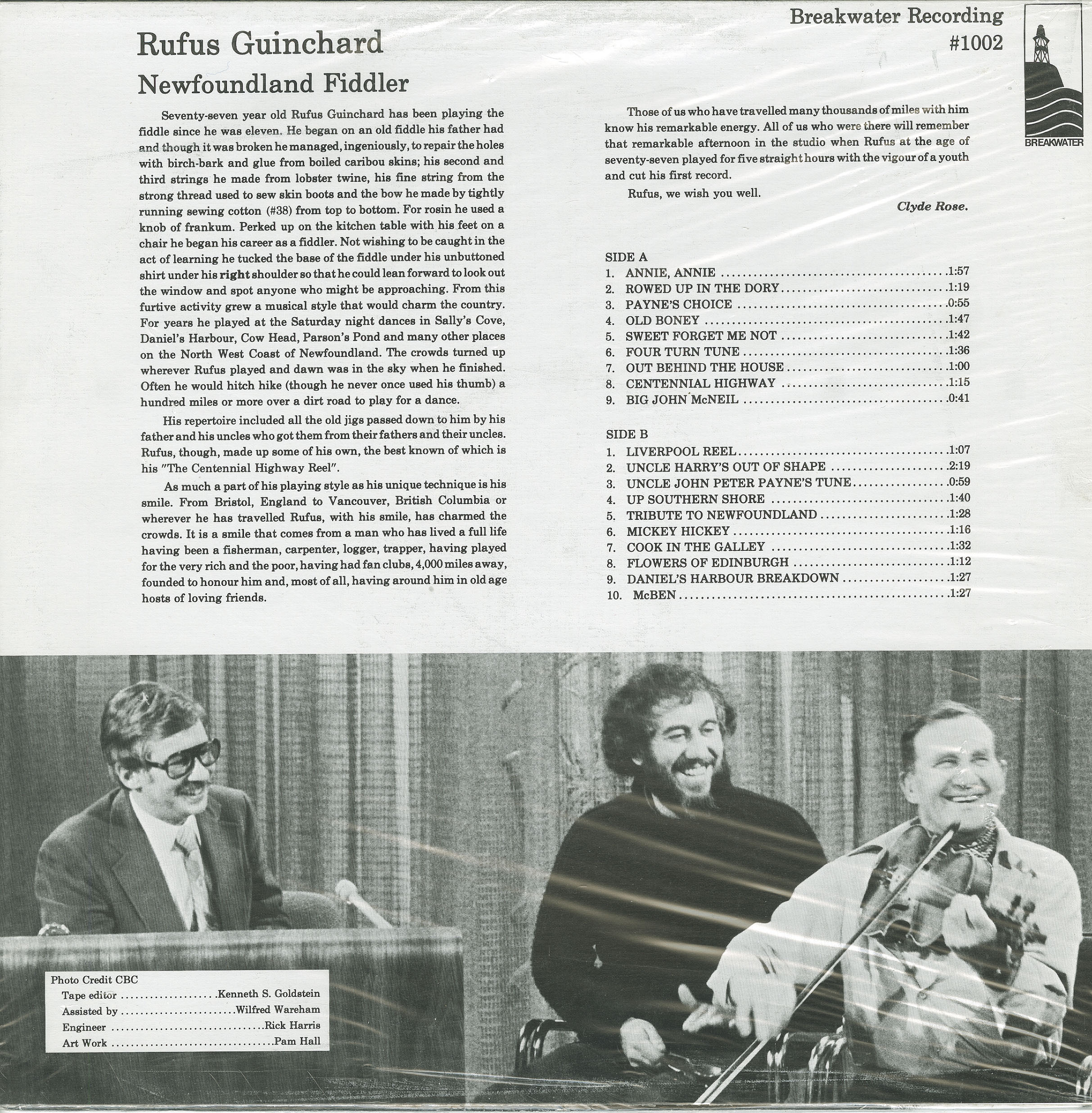 Rufus Guinchard was Born in Daniel's Harbour, Newfoundland, 1899. He began playing the fiddle at the age of eleven. Rufus, besides being a master fiddler, was an accordionist & composer. A few of the other "jobs" in his life-time were: fisherman, logger, trapper, seaman, labourer, warden and carpenter. He was a member in the mid 1970's of "The Breakwater Boys" and it was during this time that he cut his first record. He was appointed a member of THE ORDER OF CANADA in 1986. He recorded one more record before he passed from this world in 1990 at the age of Ninety-One years. His last release was issued posthumously. He travelled extensively and performed at folk festivals and events across Canada. He played at the Mariposa, Atlantic & Vancouver Festivals and at Expo 86. He also appeared in the U.S.A., England, Ireland, France, Japan (Expo 85, Tsukuba), and Australia (Expo 88, Brisbane). FABULOUS TUNES ! RUFUS' MOST FAMOUS COMPOSITION IS THE CENTENNIAL HIGHWAY REEL.