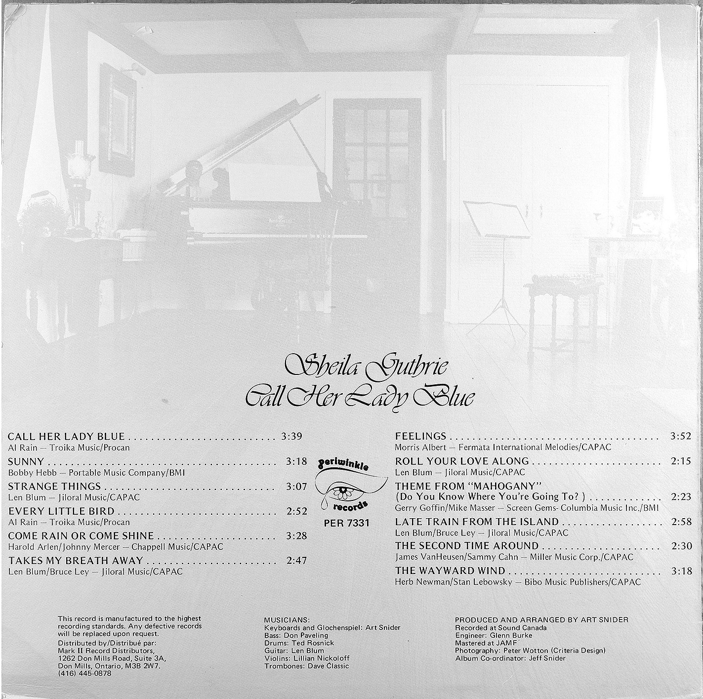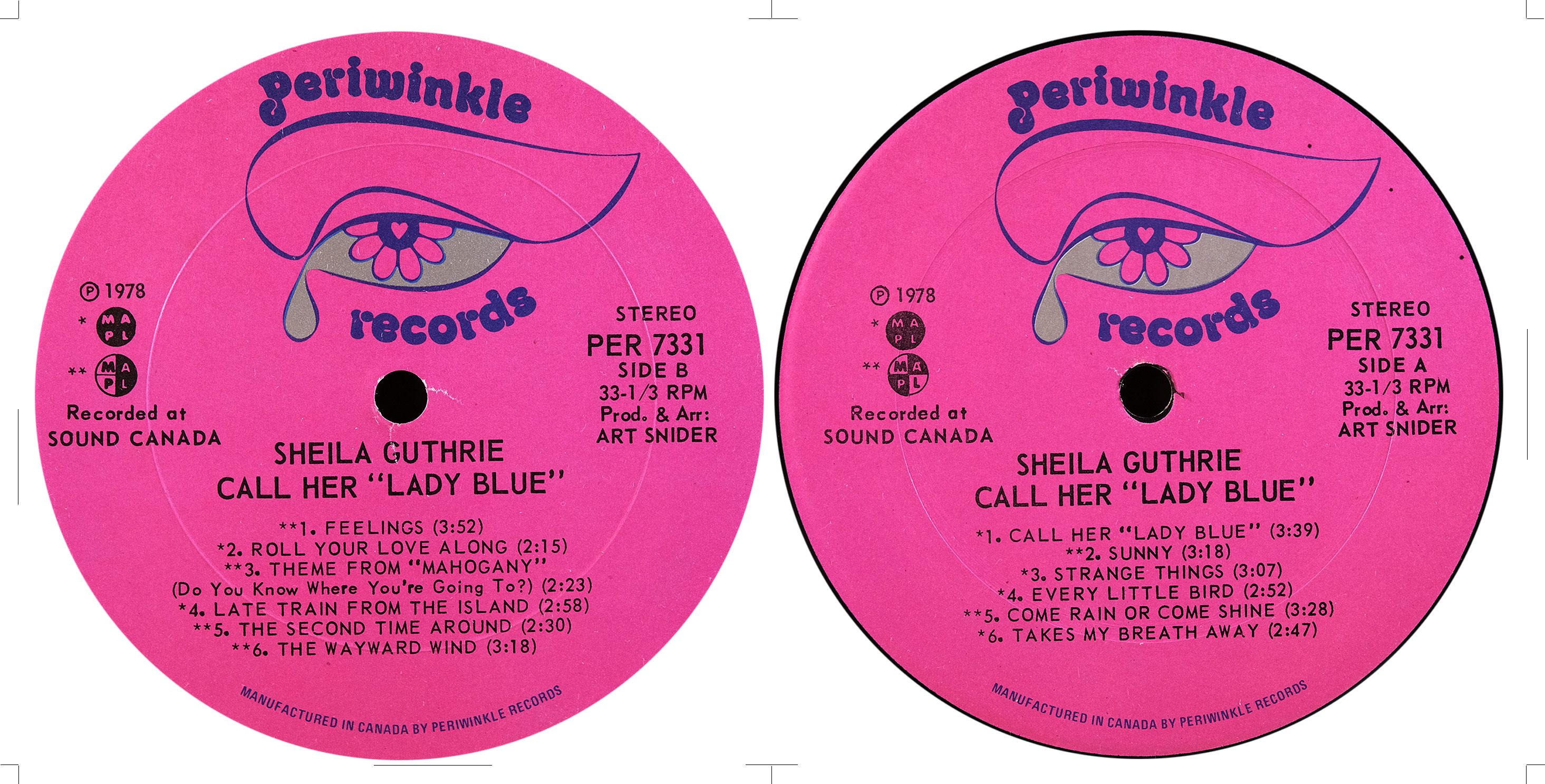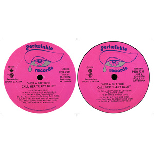 A decade later Guthrie returned with a second full-length, Call Her Lady Blue (Periwinkle PER-7331, 1978), again produced by Art Snider. Recorded at Sound Canada with a seasoned cast of Toronto musicians including Doug Riley, Brian Leonard, and Dave Classic, the album featured contemporary material such as Morris Albert’s “Feelings,” Gerry Goffin and Mike Masser’s “Theme from Mahogany,” Bobby Hebb’s “Sunny,” and a number of songs by Canadian writer Len Blum. The singles “Takes My Breath Away” and “Roll Your Love Along” received airplay, with RPM noting their release.