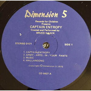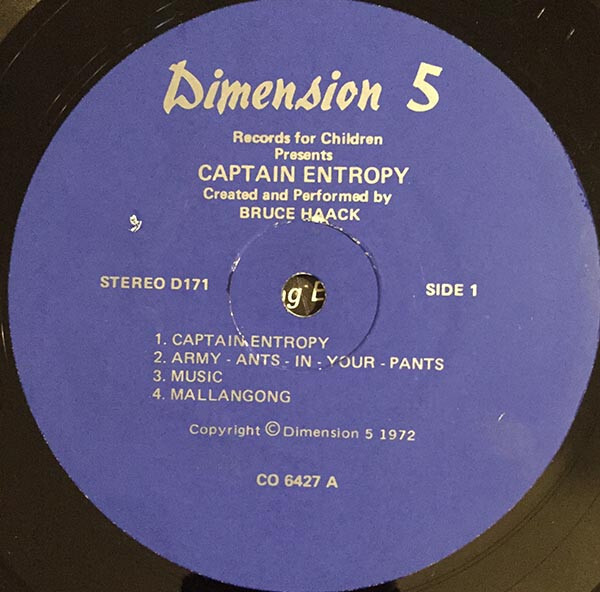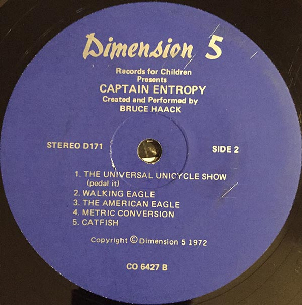 CAPTAIN ENTROPY (a participation journey for elementary and high-school people~-through the soul of space-ship earth--from principles of thermodynamics to folks like the American eagle) Created and totally performed by BRUCE HAACK." - from Original Liner Notes