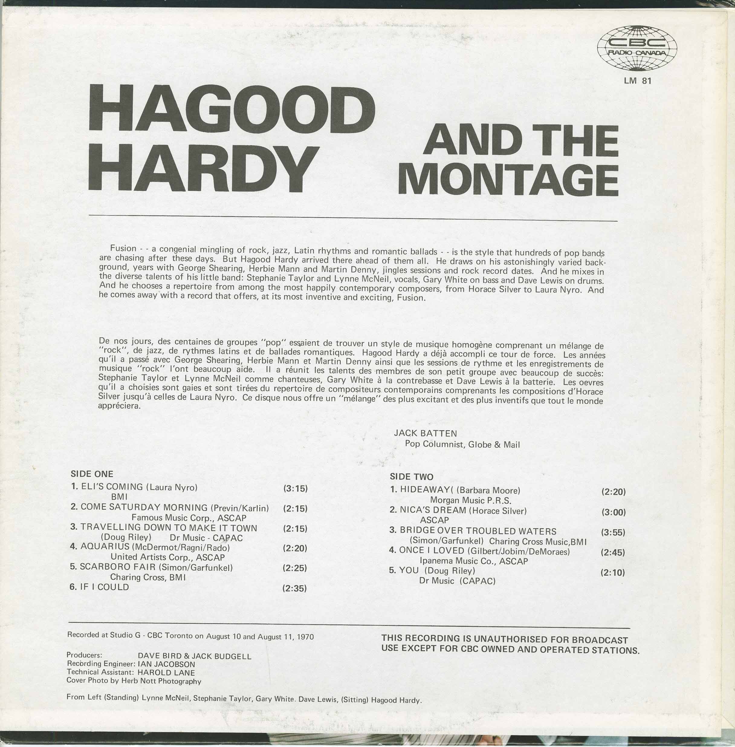 Recorded at Studio G at CBC Toronto on August 10 and 11, 1970