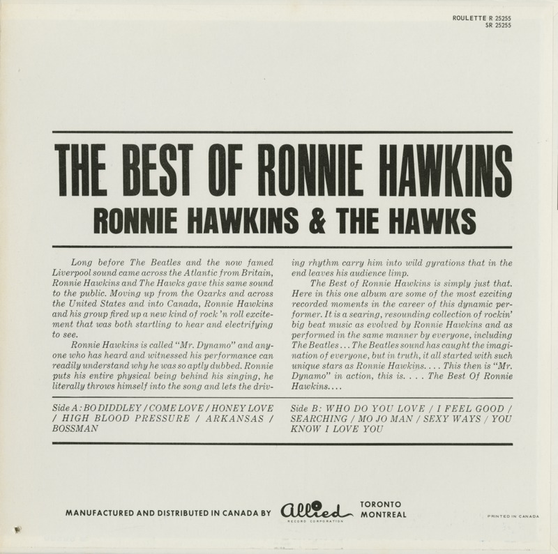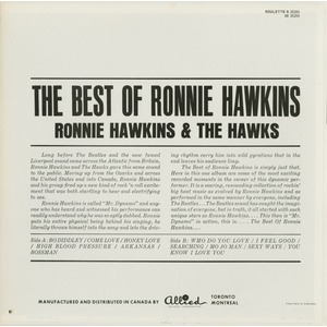 The sessionography on the Ronnie Hawkins website tells a different story. As one can see from the track list below, the album is a compilation of previously recorded material from 1961 thru 1963. Note that the Feb 2, 1962 tracks were produced by Leiber & Stoller, however the matrix numbers indicate that overdubs took place on May 7, 1963. The only other recording made during the May 1963 sessions with Henry Glover that was not included on The Best of Ronnie Hawkins, was "There's a Screw Loose" which was released on Roulette single 4502 in 1964 and appears on the 1978 UK album Rockin'.