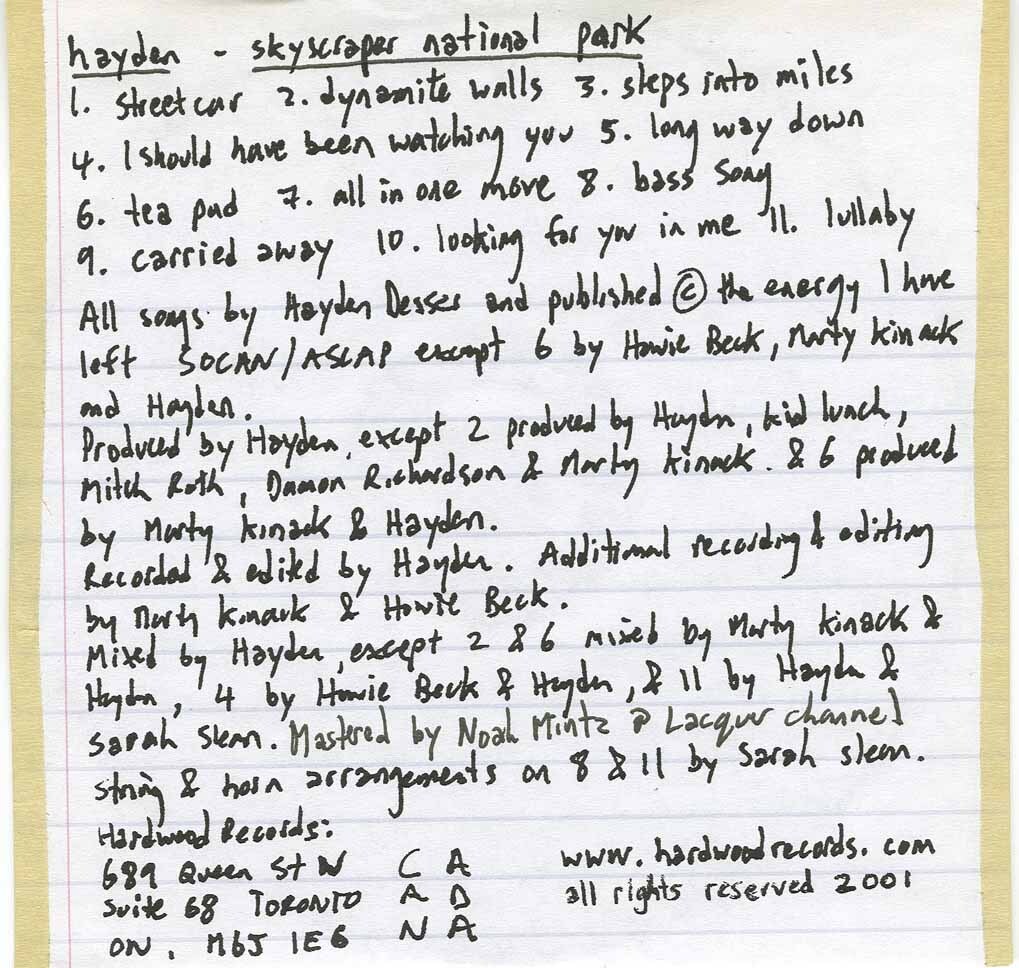 Now, after a three-year hiatus, Hayden has returned with his third LP, Skyscraper National Park. The album casts Hayden as older, wiser and more reflective. Hayden is still a man steeped in his own sensitivity, but he's changed a bit with age. Youthful, idealistic romance has grown into love, hopefulness into doubt, and anger into distance. Accompanying his maturity is a newfound and uncanny sense of restraint that both binds the disc and renders his passion haunting and compelling. Not once does Hayden burst into a growl. Instead, the album is marked by frequent reliance on a simple falsetto.