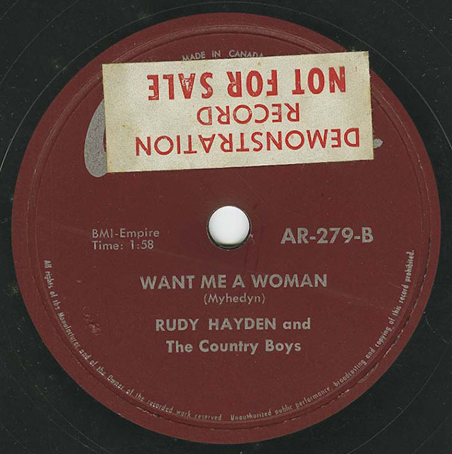 I - 1957 - Saw him in Aragon's Recording Studio cutting a song he penned "Want Me a Woman" and one that Rudy Derton wrote "Blue Steel". "Want Me a Woman" was well received in Europe. This song was included on a Netherland's label "Early Canadian Rockers". Rudy Hayden was the first Canadian artist to write and record a rockabilly tune, "Want Me a Woman" in Canada.