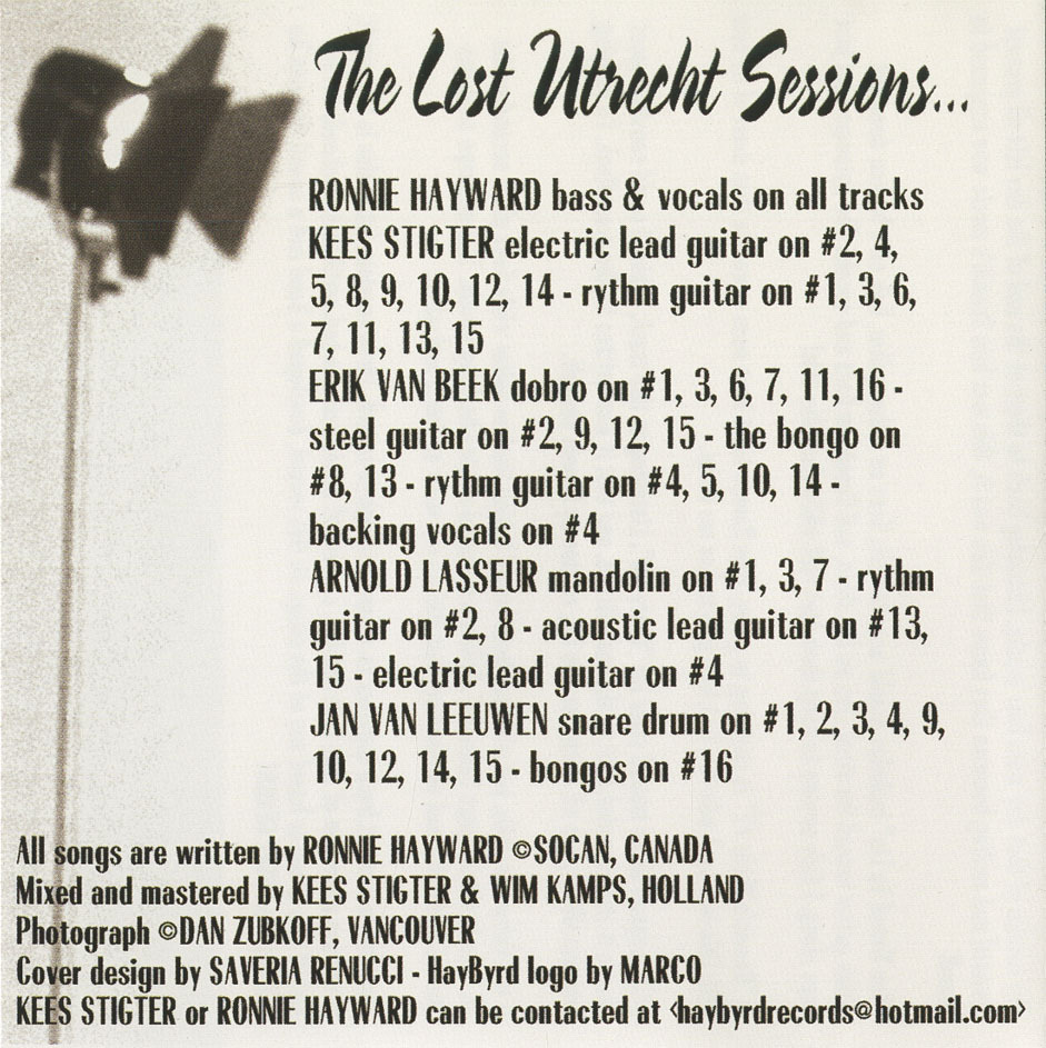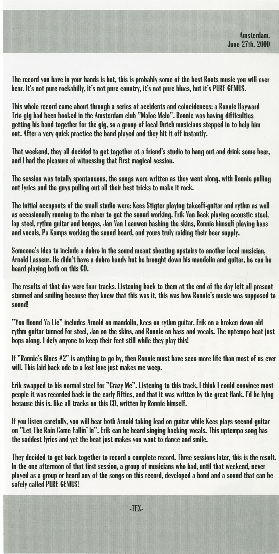 The initial occupants of the small studio were: Kees Stigter playing takeoff-guitar and rythm as well as occasionally running to the mixer to get the sound working, Erik Van Beek playing acoustic steel, lap steel, rythm guitar and bongos, Jan Van Leeuwen bashing the skins, Ronnie himself playing bass and vocals, Pa Kamps working the sound board, and yours truly raiding their beer supply.