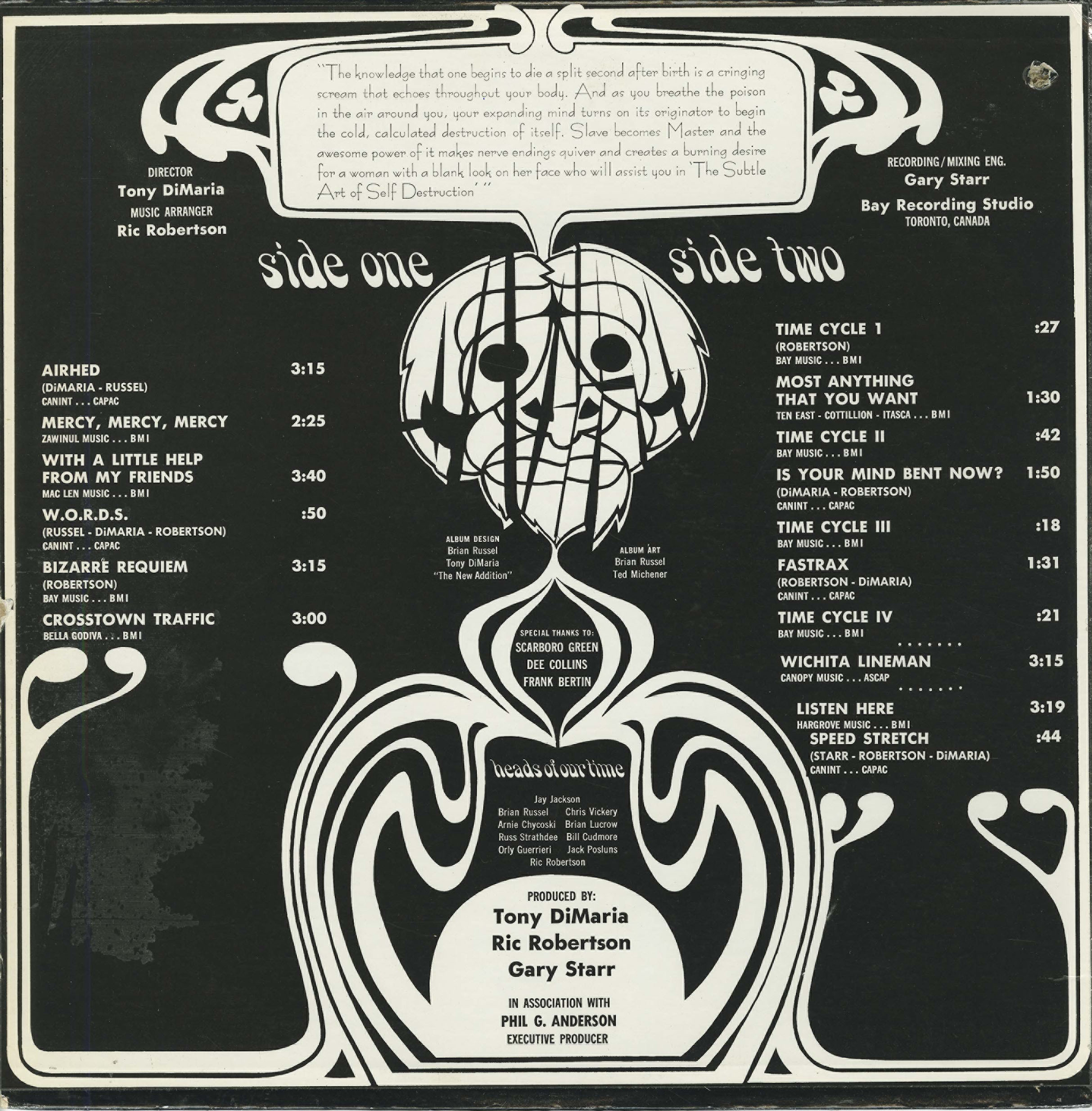 Released in 1970 on the Canadian Good Groove label (GS 7001), The Subtle Art of Self Destruction marked a decisive stylistic departure from the Majestics’ horn-driven R&B repertoire. While the earlier Arc recordings had focused largely on tight interpretations of contemporary soul hits, Heads of Our Time embraced studio experimentation, extended structures, and psychedelic production techniques reflective of the period.