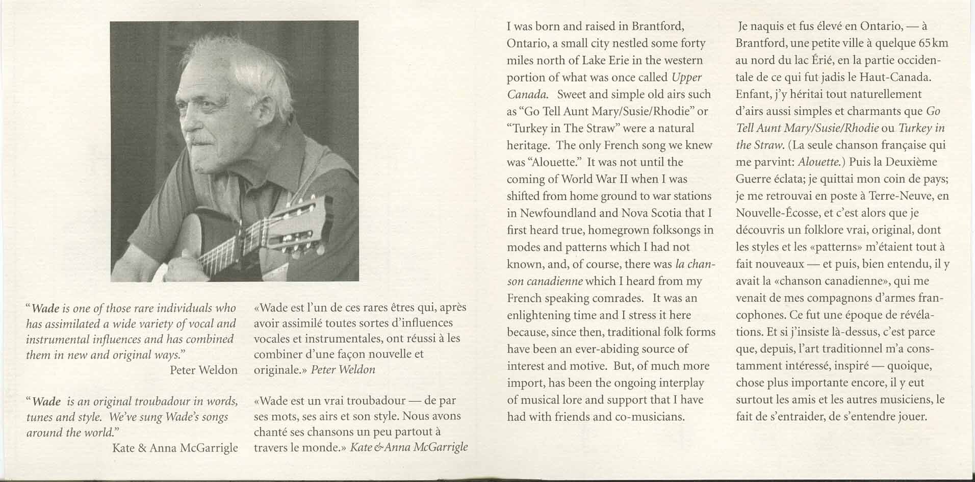Just before his 80th birthday in 1996 , Wade visited the CBC radio studios once again when he spoke with David Grierson on the program Gabereau. This interview was done when, after many years, Wade released a collection of almost all original songs. When Grierson asked Wade about his songwriting process, Wade replied " I do not dash a song off. I have an idea. I play about with chords, melody, with words..it's more difficult with the words. Then I hold it. And do it over again. I hold it for a couple of months 'til it's fit to be performed."