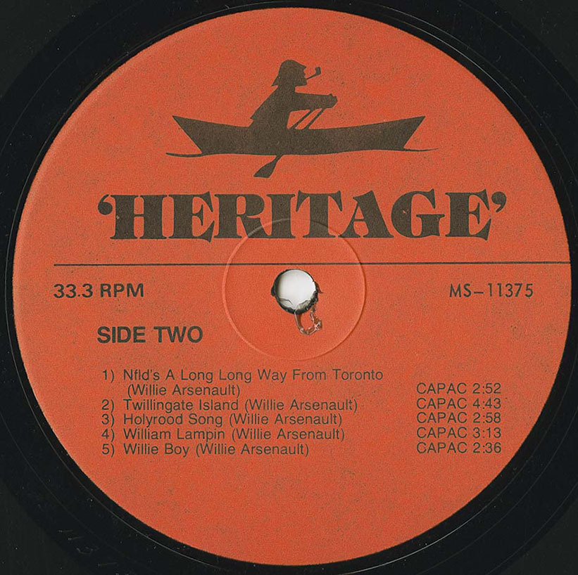 Heritage released this fabulous example of Newfandlandia in 1975 on their own private label, Heritage H.T. 0100. It was recorded by Jack Windsor at Echo Recording Studio, St. John's, Newfoundland. The album features nine compositions, all written by Willie Arsenault.