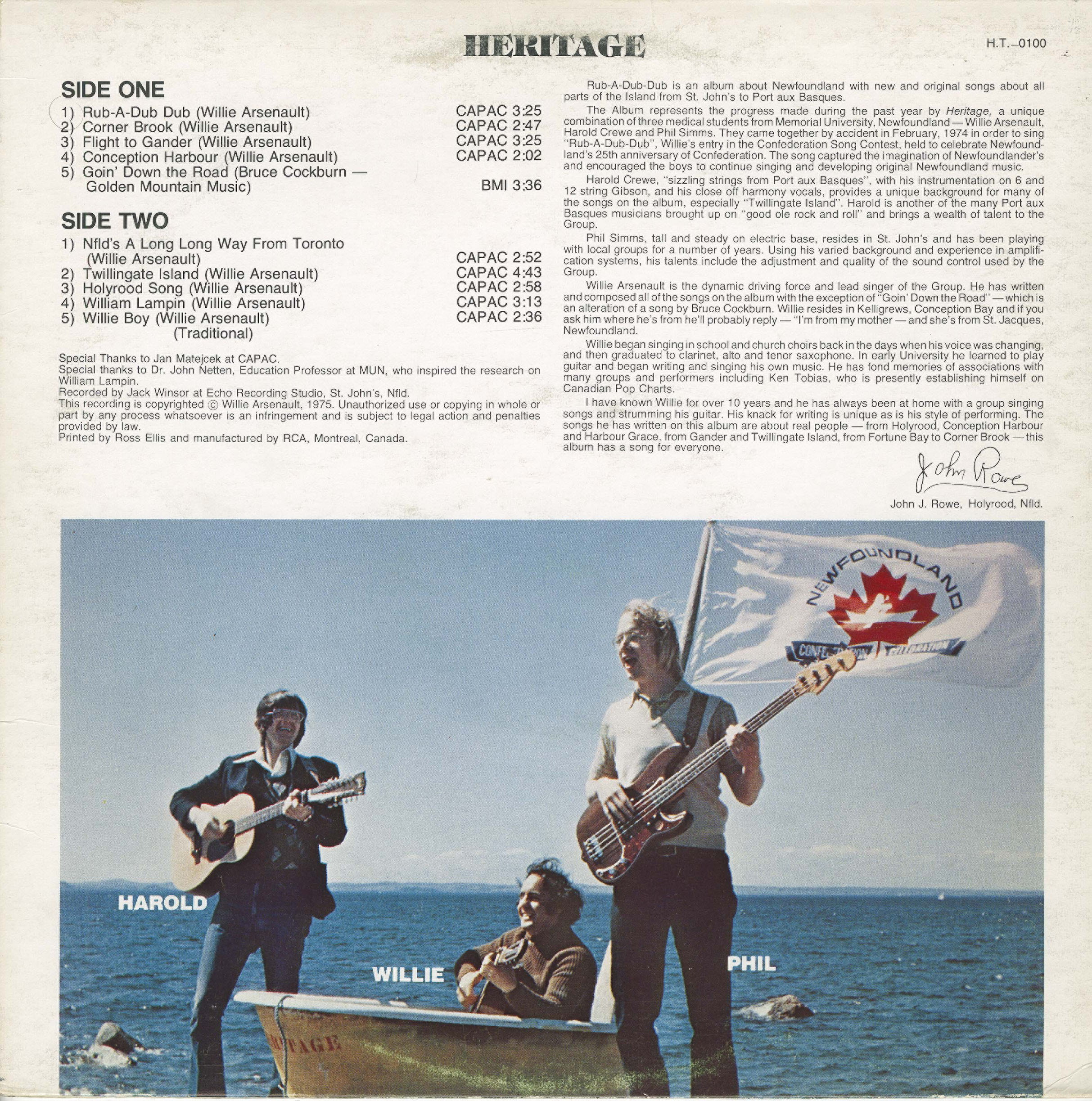 Rub-A-Rub-Dub is an album about Newfoundland with new and original songs about all parts of the island from St. John's to Port aux Basques. The album represents the progress made during the past year by Heritage, a unique combination of three medical students from Memorial University, Newfoundland - Willie Arsenault, Harold Crewe and Phil Simms. They came together by accident in February, 1974 in order to sing "Rub-A-Dub-Dub", Willie's entry in the Confederation Song Contest, held to celebrate Newfoundland's 25th anniversary of Confederation. The song captured the imagination of Newfoundlander's and encouraged the boys to continue singing and developing original Newfoundland music.