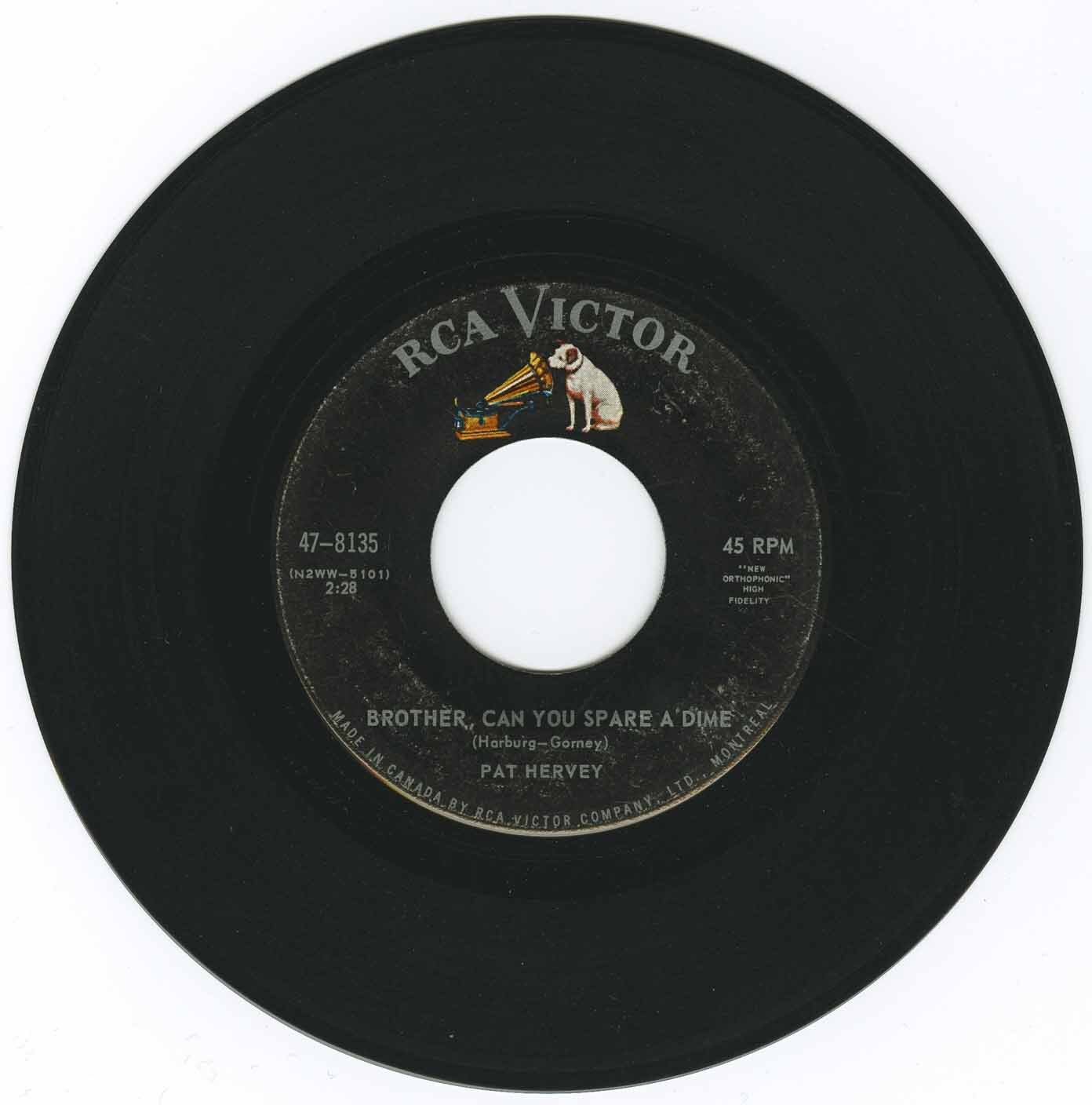Tears of Misery was produced by Chet Atkins and won a pop spotlight pick for Pat Hervey in the U.S. Billboard publication. It was a hit record in Canada reaching number 11 on the CHUM chart in Toronto and even higher in some other Canadian cities like Calgary where it rose to number 2 ! Pat does a great job of Brother, Can You Spare A Dime which also appeared on the compilation album called Make-Believe Ballroom Time, Music of the 30's on the RCA Camden label.