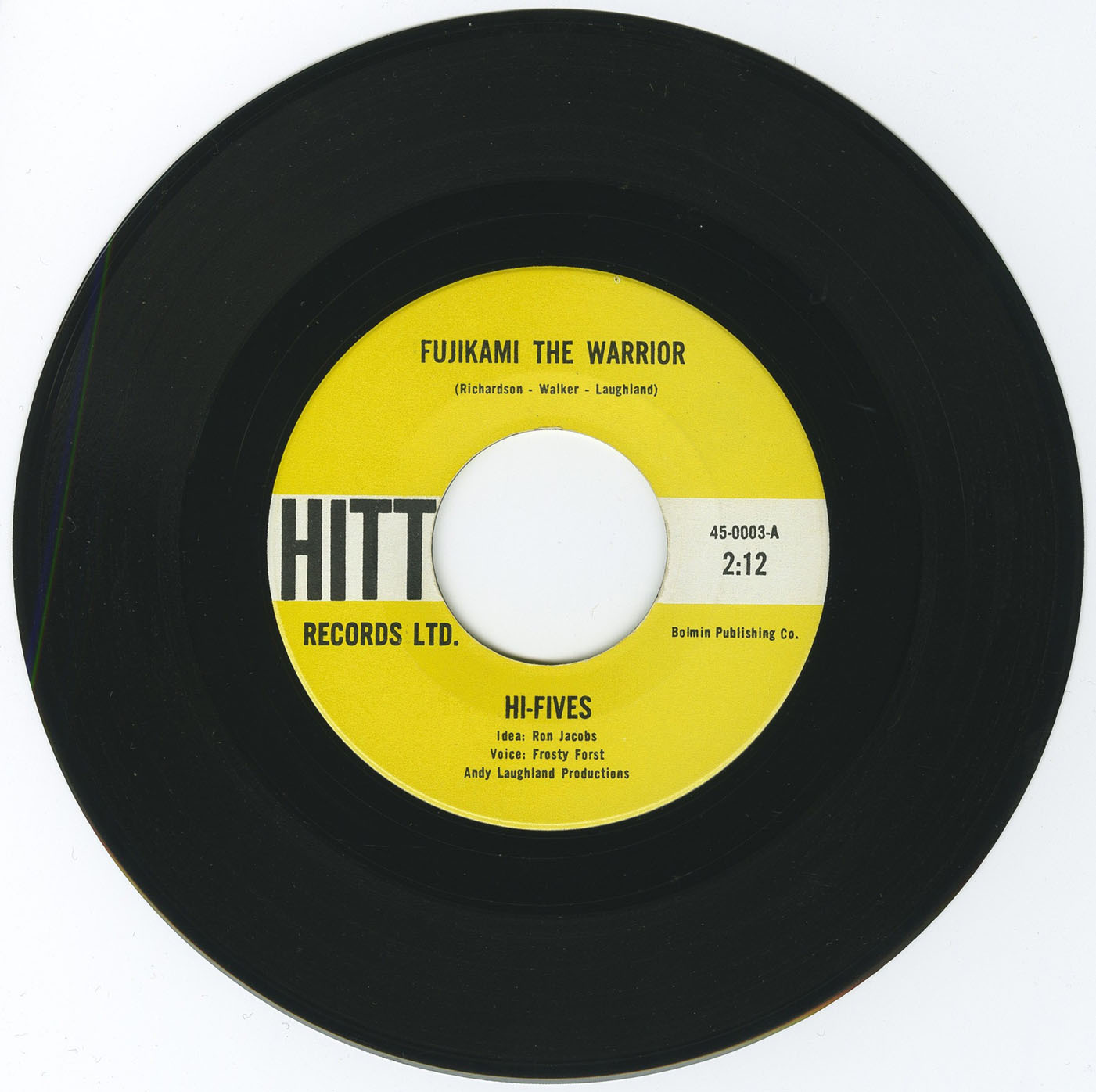 The interplay between this crazed vocalizing and the muttered agreement of The Hi-Fives in the background is most effective, creating a call and response pattern unheard of before or since. It was released on Hitt 003 and it said on the label in fine print ...Idea - Ron Jacobs, Voice - Frosty Forst, Andy Laughland Productions. "Fujikami" entered the charts Dec. 9, 1961 and reached #18.
