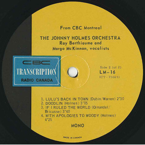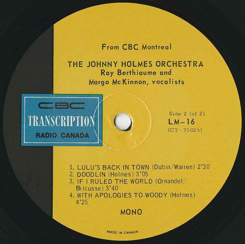 After retiring from music in 1951, Holmes returned in 1959 to front orchestras for CBC Radio. Throughout the 1960s he was heard regularly on programs like The Johnny Holmes Show and Broadway Holiday, blending Broadway sparkle, light music, and jazz into a polished orchestral style. Between 1966 and 1973 he recorded a total of six broadcast-only albums and singles for the CBC’s LM (Light Music) series. These were pressed in tiny quantities and distributed in plain stock sleeves, never sold commercially. Among them were two sought-after LPs — Johnny Holmes Orchestra – Ray Berthiaume and Margo McKinnon, vocalists (CBC LM-16, 1966) and Johnny Holmes Orchestra – Ray Berthiaume, vocalist (CBC LM-29, 1967). He then experimented with a brass-heavy ensemble under the name Brass Therapy, recording CBC LM-164 (1971, released 1973) with “Close to You,” “So Nice,” “Wave,” and “Lollipops and Roses,” and CBC LM-192 (1972), featuring For Once in My Life (arranged by Holmes), Love Story (trombone feature for Claude Blouin), Watch What Happens (guitar feature for Tony Romandini), and Lonely Is the Name. In 1972 Holmes also cut CBC LM-207, a 45 pairing Gordon Lightfoot’s “If You Could Read My Mind” and Gene MacLellan’s “Put Your Hand in the Hand” with his own composition “Rainbow” and MacLellan’s “The Call.” His final entry came with CBC LM-266 (1973), a 45 featuring “Si tu parais” and “Alouette.”