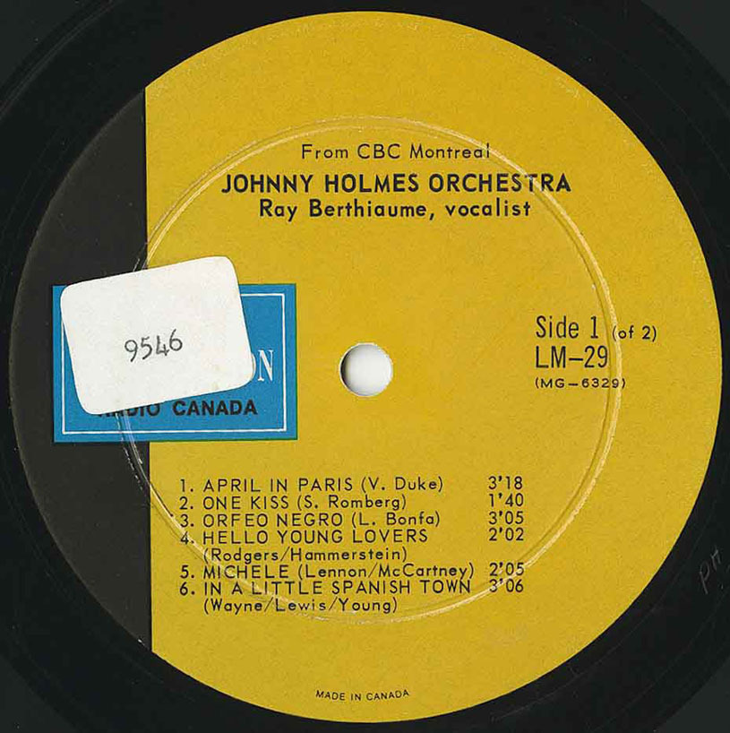 After retiring from music in 1951, Holmes returned in 1959 to front orchestras for CBC Radio. Throughout the 1960s he was heard regularly on programs like The Johnny Holmes Show and Broadway Holiday, blending Broadway sparkle, light music, and jazz into a polished orchestral style. Between 1966 and 1973 he recorded a total of six broadcast-only albums and singles for the CBC’s LM (Light Music) series. These were pressed in tiny quantities and distributed in plain stock sleeves, never sold commercially. Among them were two sought-after LPs — Johnny Holmes Orchestra – Ray Berthiaume and Margo McKinnon, vocalists (CBC LM-16, 1966) and Johnny Holmes Orchestra – Ray Berthiaume, vocalist (CBC LM-29, 1967). He then experimented with a brass-heavy ensemble under the name Brass Therapy, recording CBC LM-164 (1971, released 1973) with “Close to You,” “So Nice,” “Wave,” and “Lollipops and Roses,” and CBC LM-192 (1972), featuring For Once in My Life (arranged by Holmes), Love Story (trombone feature for Claude Blouin), Watch What Happens (guitar feature for Tony Romandini), and Lonely Is the Name. In 1972 Holmes also cut CBC LM-207, a 45 pairing Gordon Lightfoot’s “If You Could Read My Mind” and Gene MacLellan’s “Put Your Hand in the Hand” with his own composition “Rainbow” and MacLellan’s “The Call.” His final entry came with CBC LM-266 (1973), a 45 featuring “Si tu parais” and “Alouette.”