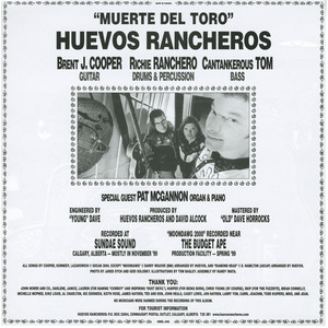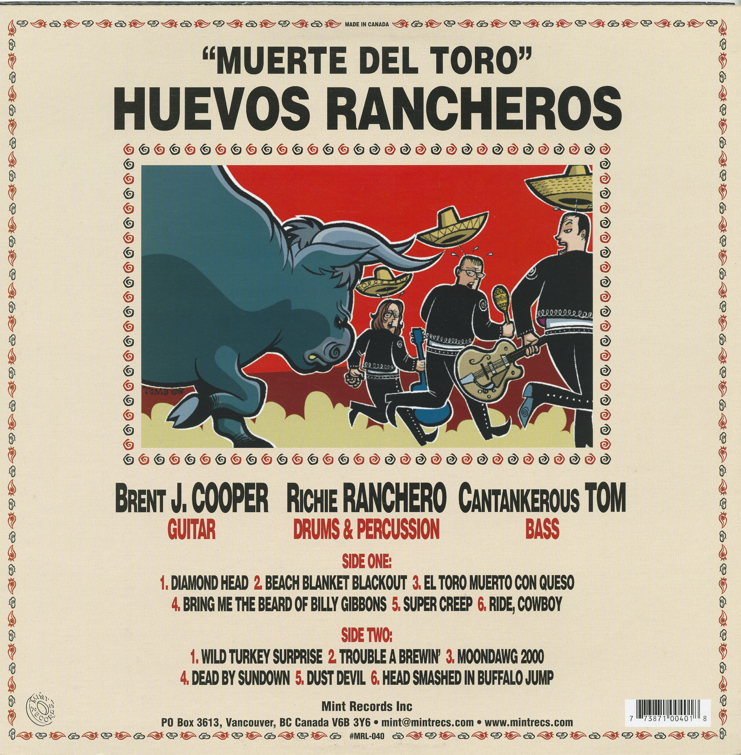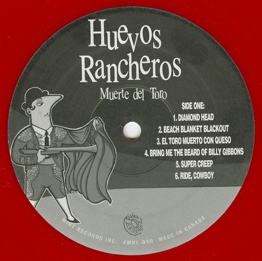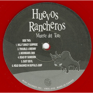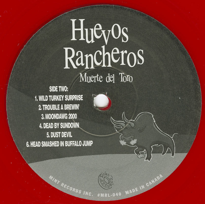 Recorded at Sundae Sound in Calgary, Alberta, with Calgary's Dave Alcock of Chixdiggit fame once again twiddling the Ranchero knobs, Muerte Del Toro is their fourth long player, and their third on Mint Records! And to add to their famed guitar-bass-drums wordless frontal assault, Huevos Rancheros have tossed some well-placed keyboards and organ in to the mix too! Tracks include a re-do of the acclaimed "Wild Turkey Surprise" that originally appeared on Huevos Rancheros' summertime '99 single that was released to coincide with their tour with the Reverend Horton Heat. Artwork? Done up by -- who else?! -- graphic artist extraordinaire, Captain Tom Bagley! Also on 12" red vinyl!