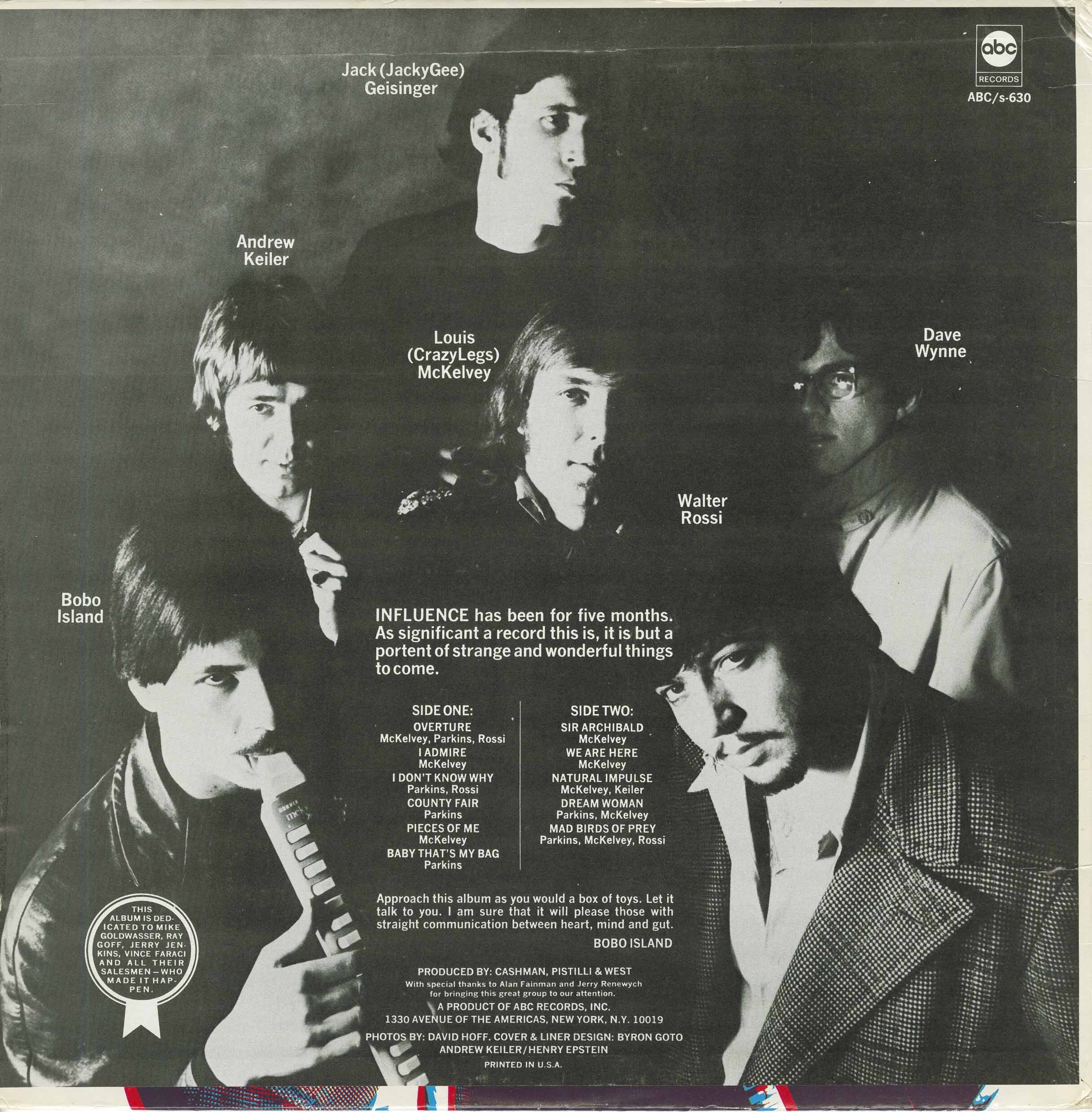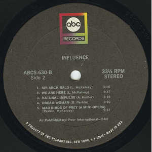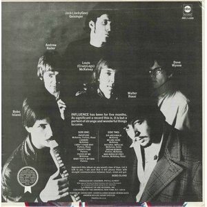 In late 1967, the band sent a demo tape to producer Dennis Minogue at ABC Records in New York and subsequently recorded a lone album on four-track that was issued early the following year. "Influence" is a startling piece of music and clearly shows how unique the band was. However, it didn't sell well and is now something of a collector's item. The highlights include the chanson styled "I Don't Know Why", composed by Rossi and Island, and heavier pieces like McKelvey's "Natural Impulse" and "Pieces of Me", the latter co-written with Andy Keiller.