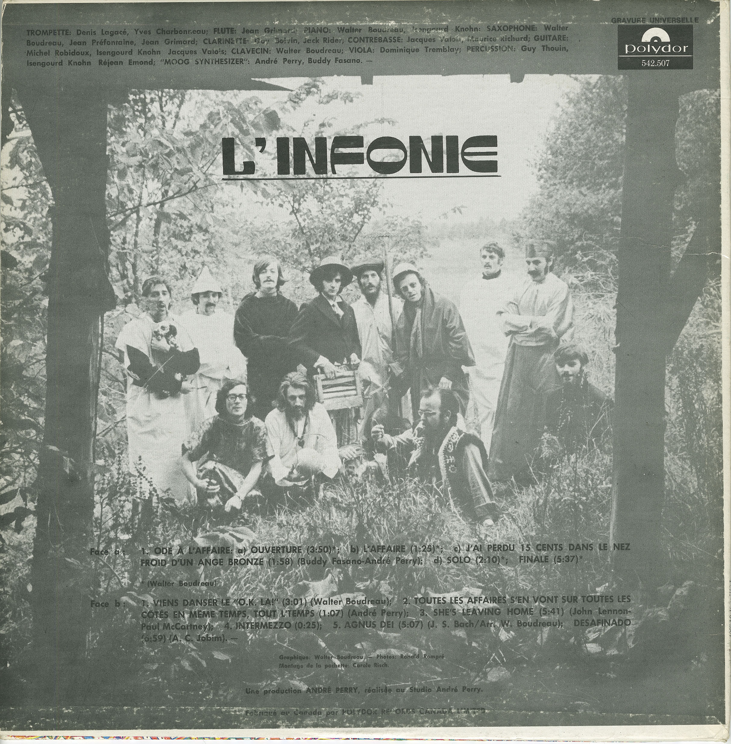 Boudreau himself would later write in Raoul Duguay: Ou, Ie poete a la voix d'o (1979): "L'Infonie is part of a historical movement that tried to shake the foundations of our culture. Shock, surprise instead of just trying to please. Going against the grain. In those days the group members weren't drop-outs, but were out of the usual standard of clean and too polite. We had seen enough, we went out of our way to be extreme, wearing toilet seats or hangers on our head for example. It might not have been totally articulated. The affinity between Raoul and myself and the other members of l'Infonie, wasn't much in what we had to say, but more in the food, sex, philosophy, music. All was subject for change."
