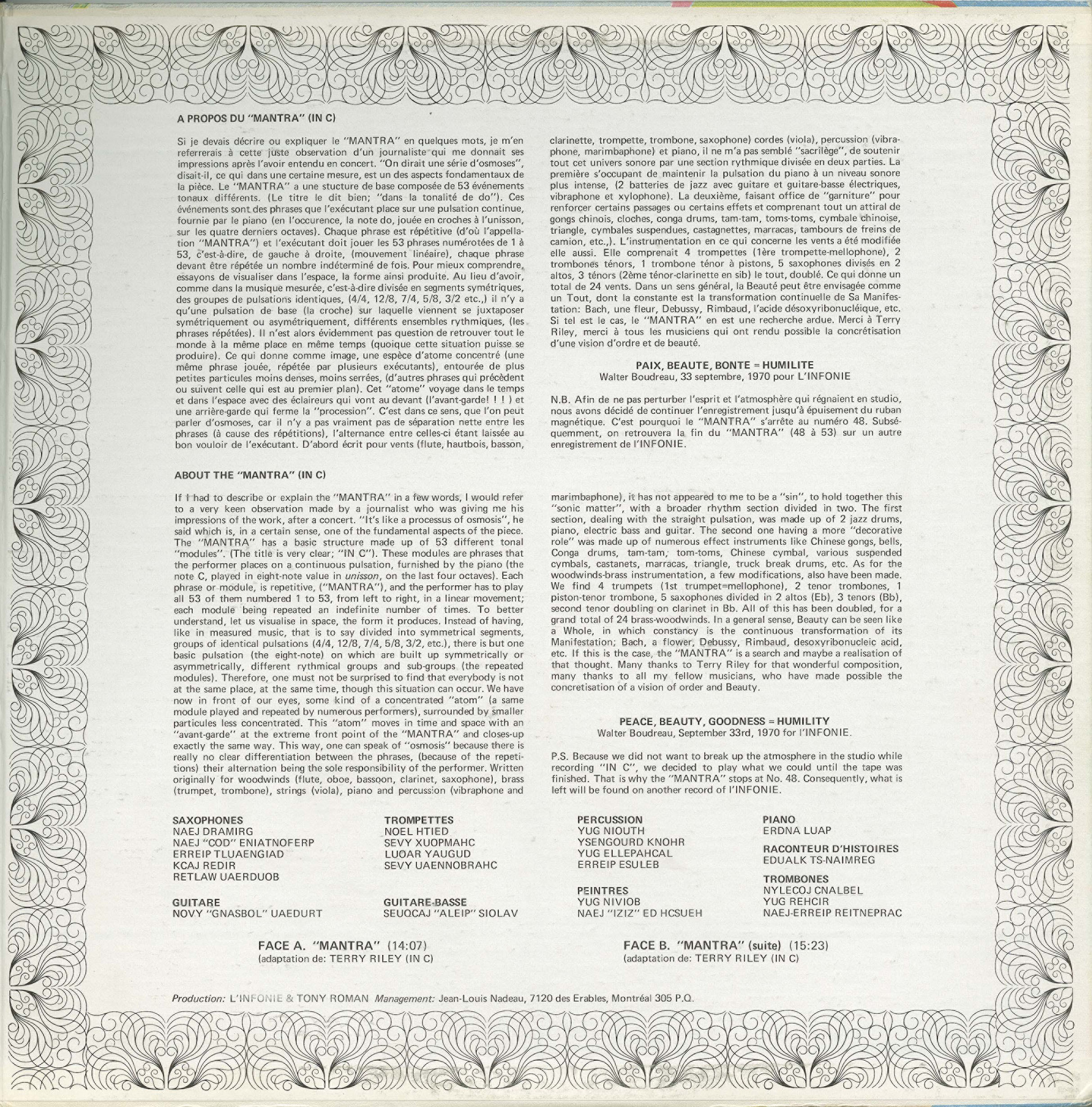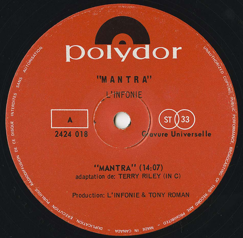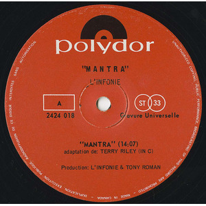 For it's second album, L'Infonie recorded Walter Boudreau's arrangement of Terry Riley's landmark piece for wind ensemble "In C," here re-titled "Mantra." Boudreau modified it in order to fit L'Infonie's possibilities, but he also added a rhythm section. Therefore, this is the grooviest version of "In C" ever recorded. The bass (electric) and drums support the piano's pulsation, while an assortment of percussion instruments are used to punctuate events as they happen in order to give the piece relief. Riley's score is made of 53 short events placed on a pulsation. Each player has to move from the first to the second to the third, etc., until he reaches number 53, but he can repeat each of them as many times as he wants. Therefore, the piece evolves through some kind of osmosis. This impression is very palpable in L'Infonie's interpretation. The studio they recorded in was using 30-minute tape reels, so the album fades out around number 48. In the liner notes, Boudreau announced the remaining part would be released on a future L'Infonie record, but that promise was never fulfilled.