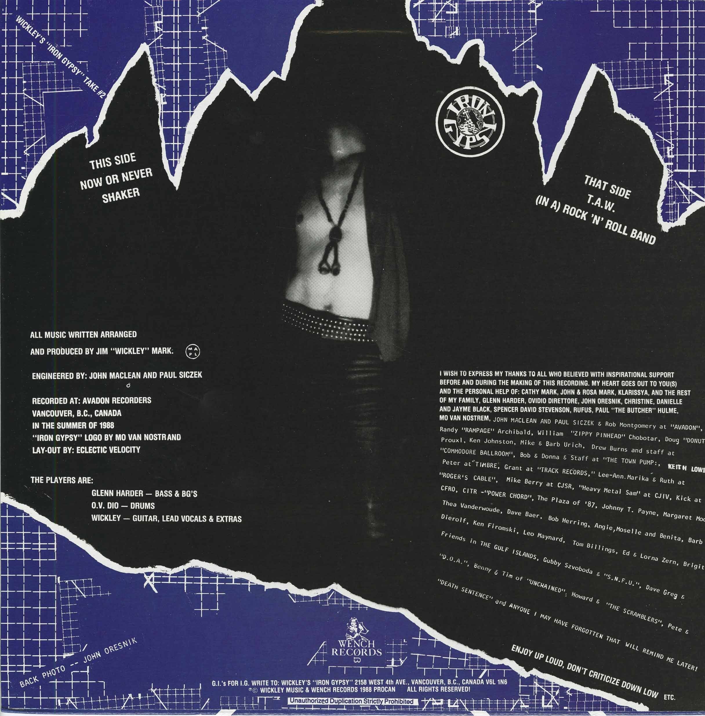 IRON GYPSY was formed in Hamilton, Ontario 1983. The members then were Ed 'Breaker' Zern on drums, and Glenn Harder on bass and vocals. I met these two fine musicians while I was living in Edmonton, Alberta. I played in a bar band called X-Static with them. Domestic issues around general survival dissolved that line-up, while in Hamilton. Neither of us had studio experience at that time, but we did have plenty of 'live'. I moved back to Edmonton, their home, to re-form, but both were committed to other projects, so I continued on to Vancouver, a city with more to offer, so I thought. I set myself up with a job... bought a Teac 4 track recording machine, and proceeded to get the songs out of my head.