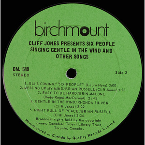 We thought of calling them “The C.C.M. Bicycle Pump”. Or maybe “The Unisex Telephone”. Sure, they do group numbers — such as “Eli’s Coming” and “Here Comes the Sun”, but at the same time, their individual solo performances are refreshing and exciting. It was not simply by accident that they were brought together for the purposes of this album! And so they are SIX PEOPLE — six very talented people.