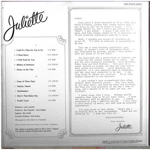 By the mid-sixties the ratings had dipped and, in CBC executive's jargon, “scored low on the enjoyment index” and the show was given the axe. The dresses went up for sale and became highly sought after fashion items, purchased by connoisseurs: Vancouver's drag queens. Impersonating “our pet Juliette” scored very high on the queen's “enjoyment index.” She was made a member of the Order of Canada in 1975 and in 1999 given a star on Canada's Walk of Fame in Toronto. Juliette recorded two 78s for RCA's 'X' label and one with the Rhythm Pals for Aragon in the early 1950s and later made three LPs for RCA Camden. CBC also recorded many transcription discs of the Juliette show. Harshly criticized by the high brow media for her kitschy pop, she would venture on occasion in folk territory. Using her popularity, she notably promoted Canadian authors by introducing their songs to a national audience.